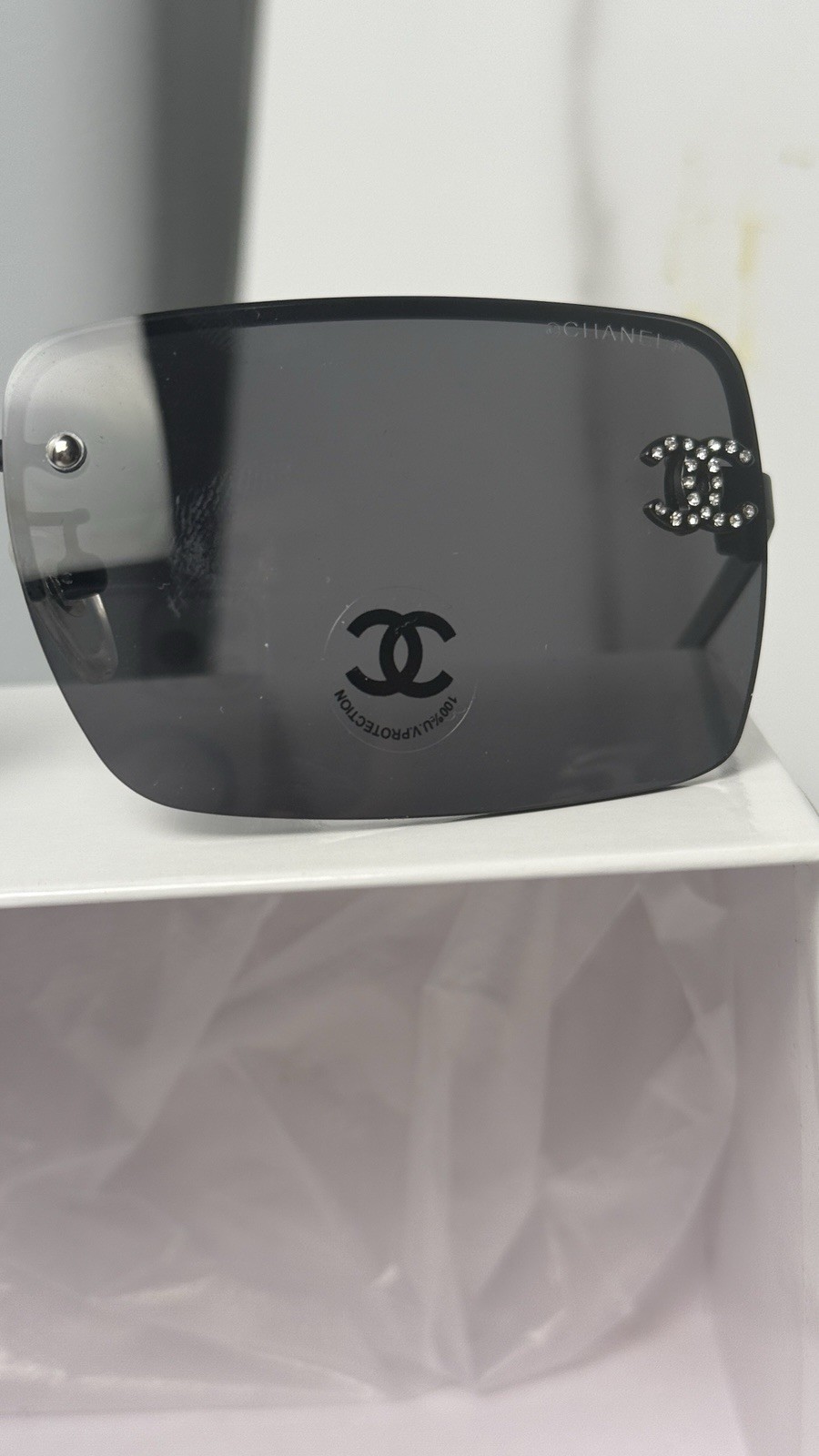 The vintage Chanel Black Rimless Sunglasses are a stylish and iconic accessory for women. Featuring a square design with a black frame and polarized black lenses, these sunglasses are a classic piece from Chanel's collection. The rhinestone CC logo adds a touch of luxury to the metal frame, making them a timeless and elegant choice for any outfit. Made in Italy, these sunglasses come in a chic case with a cloth for easy storage and maintenance. Perfect for adding a touch of sophistication to any ensemble, these Chanel sunglasses are a must-have piece for any fashion-forward wardrobe.