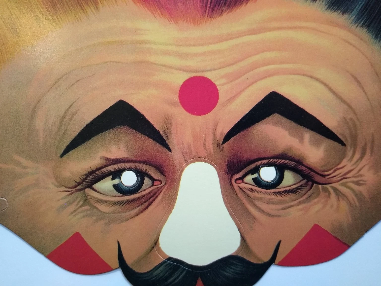 This is a vintage character paper mask, featuring a double-sided print design. One side displays vibrant, multi-color graphics with a flesh-toned face, prominent black eyebrows, a red bindi-like dot, a white nose, a black mustache, and a crown-like headpiece in shades of orange, red, and yellow. The reverse side features a sepia-toned version of the same character design, maintaining the intricate facial details and crown structure. This unique mask is crafted from durable paper or cardboard, indicative of classic party or theatrical accessories. It includes the single character mask as pictured. Verified specifications: Brand/Maker: Unbranded Item Type: Mask / Eye Mask Era/Style: Vintage Character Material: Paper / Cardboard Features: Double-sided print Included components: 1 mask as pictured