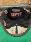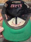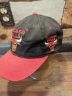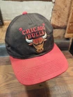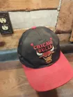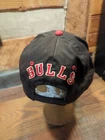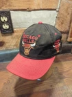 Vintage Chicago Bulls snapback hat in faded black with a spell out design. The hat features a classic 90s style with a sports theme, making it a unique accessory for men. The one-size snapback design adds to its retro appeal, perfect for fans of vintage sports fashion.