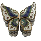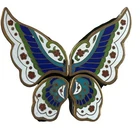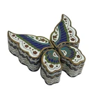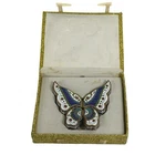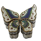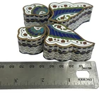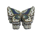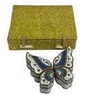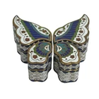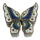 This vintage Chinese Cloisonné trinket box set features a beautiful 4 piece butterfly puzzle design. Each box is meticulously crafted with vibrant colors and intricate enamel detailing. Expertly made in China, this set is a true testament to traditional Chinese craftsmanship. These boxes are perfect for storing small treasures and will make a lovely addition to any collection. Great condition with original gift box. The gift box has some staining. Please see all pictures.