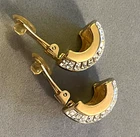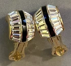 Guaranteed 100% authentic Christian Dior with clear baguette rhinestones and black enamel gold plated clip on earrings. They are like a creole or half-hoop style earrings. Each earring measures about 7/8 inch (2.2 cm) tall and 5/8 inch (1.6 cm) wide. Marking is "Chr. Dior ©" on the clip part of each earring. Condition is excellent and the baguette rhinestones are sparkling. A dime is placed for size reference and not included. Please check out all pictures I have taken personally of the actual item. I do not accept return on this item due to delicate jewelry item. I describe my item exactly what it is. I personally took the pictures and measurements myself. * * * Non-smoking environment! * * *