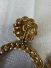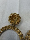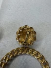 These vintage Christian Dior earrings feature a unique design with a hoop loop clip style. Signed by the brand, these earrings are a rare find and are sure to make a statement with their drop/dangle style. With no main stone, these fashion earrings are a timeless and elegant addition to any jewelry collection. These are marked Christian Dior on the backside of the clip on both earrings. One earring seems to have a slightly smaller circle compared to the other one. These have not been authenticated by Christian Dior and are being sold as is. In the photos, you can see some wear between the two loops where the color is fading. These do have some damage to them as shown in photos and stated in the description. One of the fabric type pieces is missing on the clip area as shown in photos. Please see photos for discoloration and missing piece. These are being sold as is.