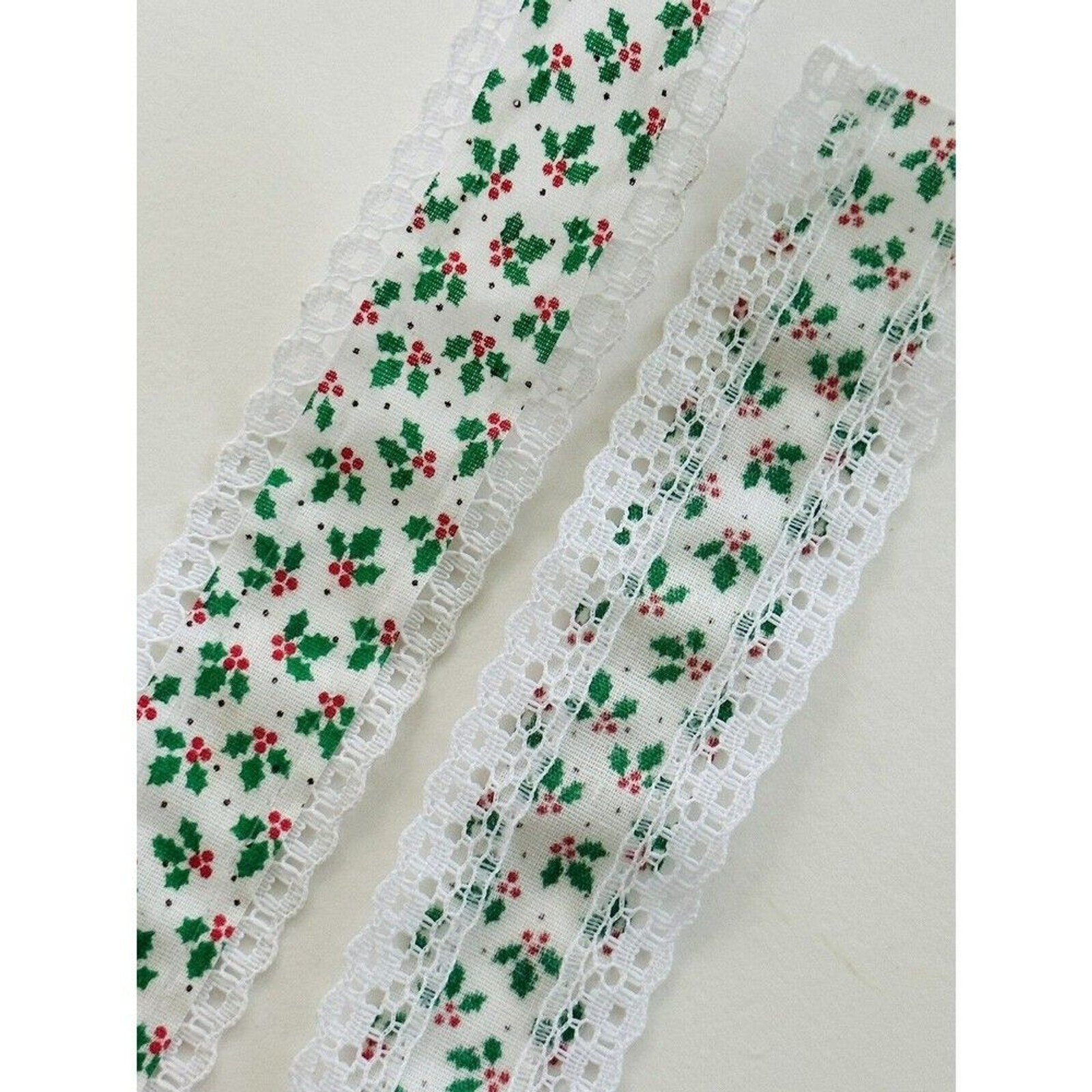 Vintage Christmas Holly & Ivy Lace Edge Trim Xmas Lace Trim 10yds Measurements: 10 yards x 1-1/4" width - Multiple Yards available - Message me if you would like more or less yards. Material: Cotton blend My home is pet free and smoke free; however, some items were acquire and have unknown history. To view other items I have for sale, click on my name. I am willing to bundle to save on shipping. #trim #lace #xmastrim #winksstoreroom #vintagetrim