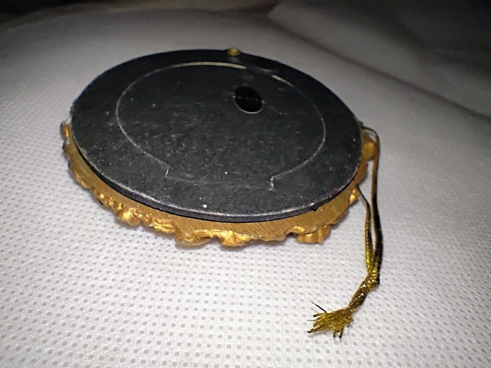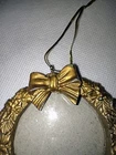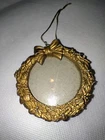 This Vintage Christmas Photo Frame Ornament is a small round wreath in a floral poinsettia pattern, The small gold plastic frame measures 3 inches in size and is perfect for Christmas decor. Just imagine waking up Christmas morning, and seeing your loved ones hanging on your Christmas tree in this cute little poinsettia wreath ornament. This ornament is a charming addition to any holiday collection, capturing the essence of the festive season with its Christmas theme.