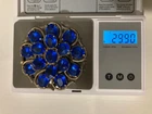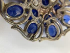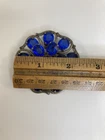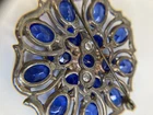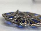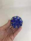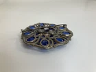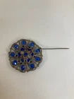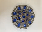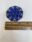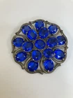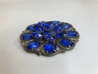 Vintage Circle BROOCH Victorian style C Clasp & Round Hinge 16 Blue 2.25” I am not certain what material the rhinestones are. Metal is a softer variety. Possibly lead? Tested negative for silver. Measures approximately 2.25” diameter. Weighs about 30 grams.