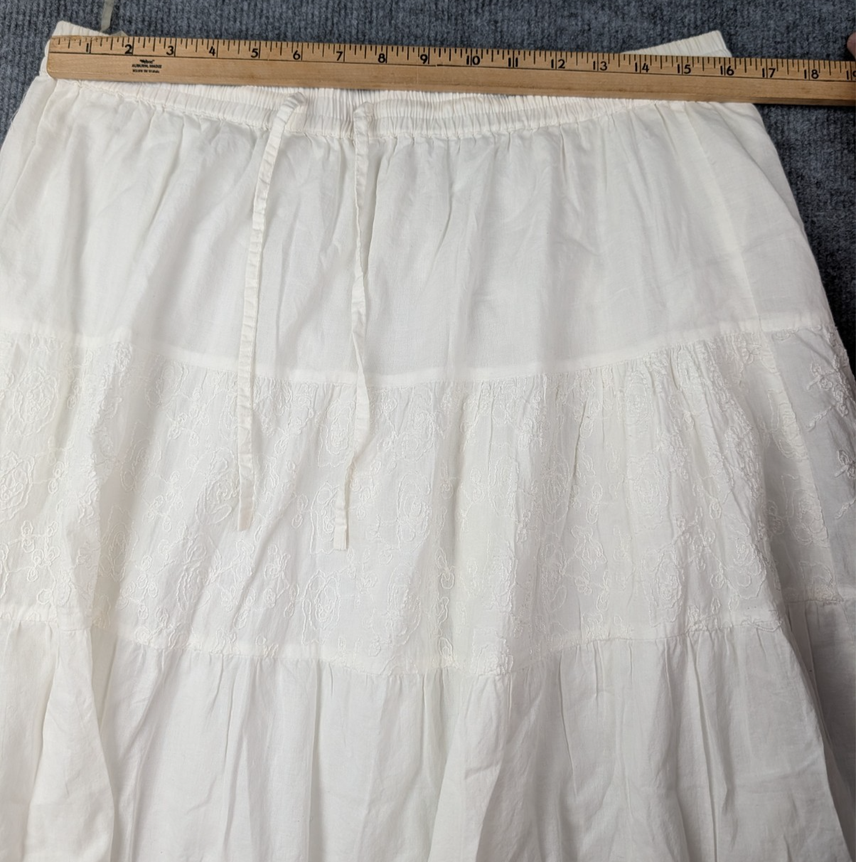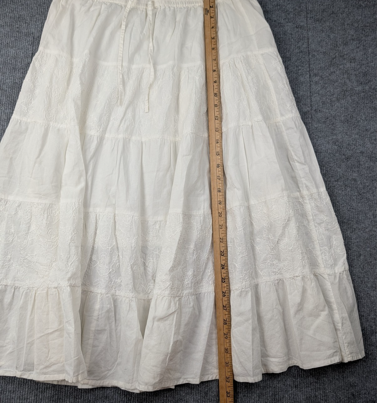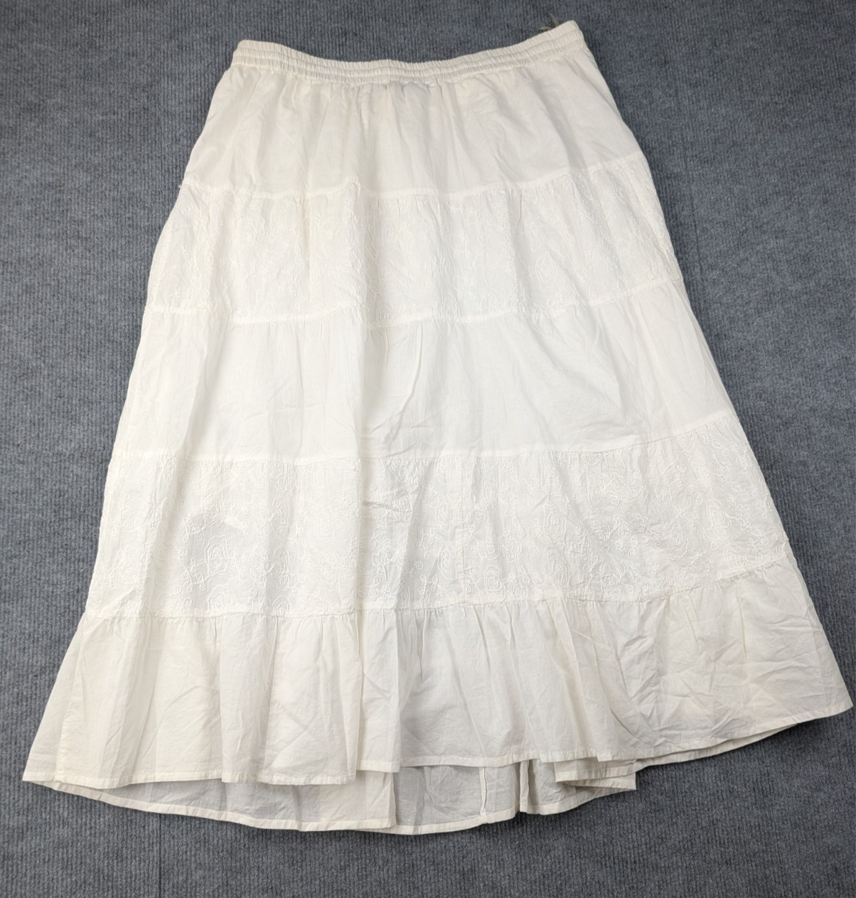 Brand: Claudia Richard Type: Skirt Department: Women Size: XL Color: White Material: 100% Cotton Style: Tiered Maxi Skirt Features: Elastic Waist, Drawstring, Embroidered Panels, Ruffled Hem Pattern: Solid with Embroidery Made In: India Care Instructions: See care label Occasion: Casual, Boho, Resort Condition: Pre-owned