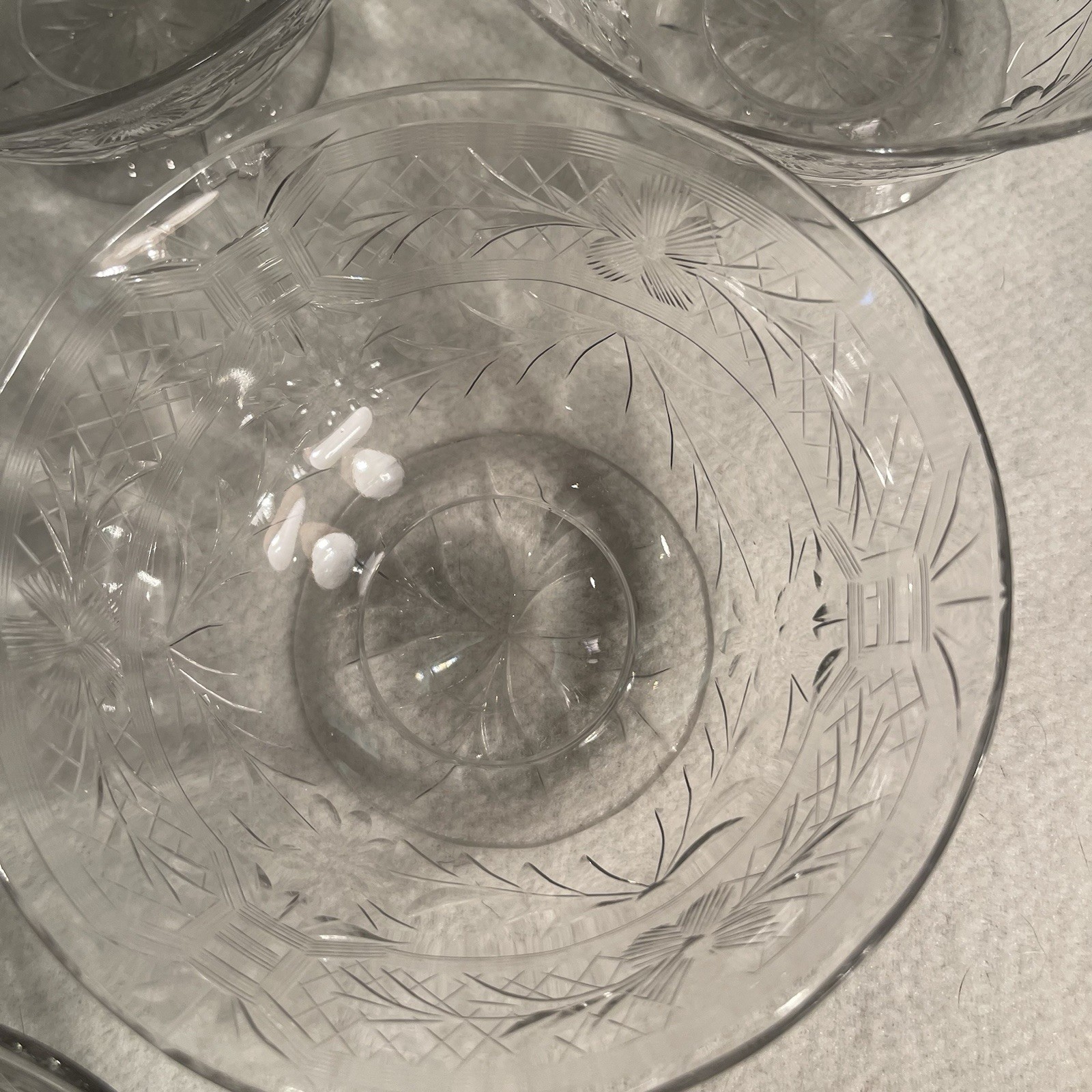 This vintage six-piece set of crystal clear dessert and berry bowls features an etched floral pattern, adding a touch of elegance to any table setting. The round shape and mid-century modern style make them a perfect addition to any home decor. Made with elegant glass production technique in the 1960s, these footed bowls are not only decorative but also practical for serving your favorite desserts and berries. Ideal for collectors or those looking to add a unique touch to their dinnerware collection. Excellent condition. No chips or cracks.