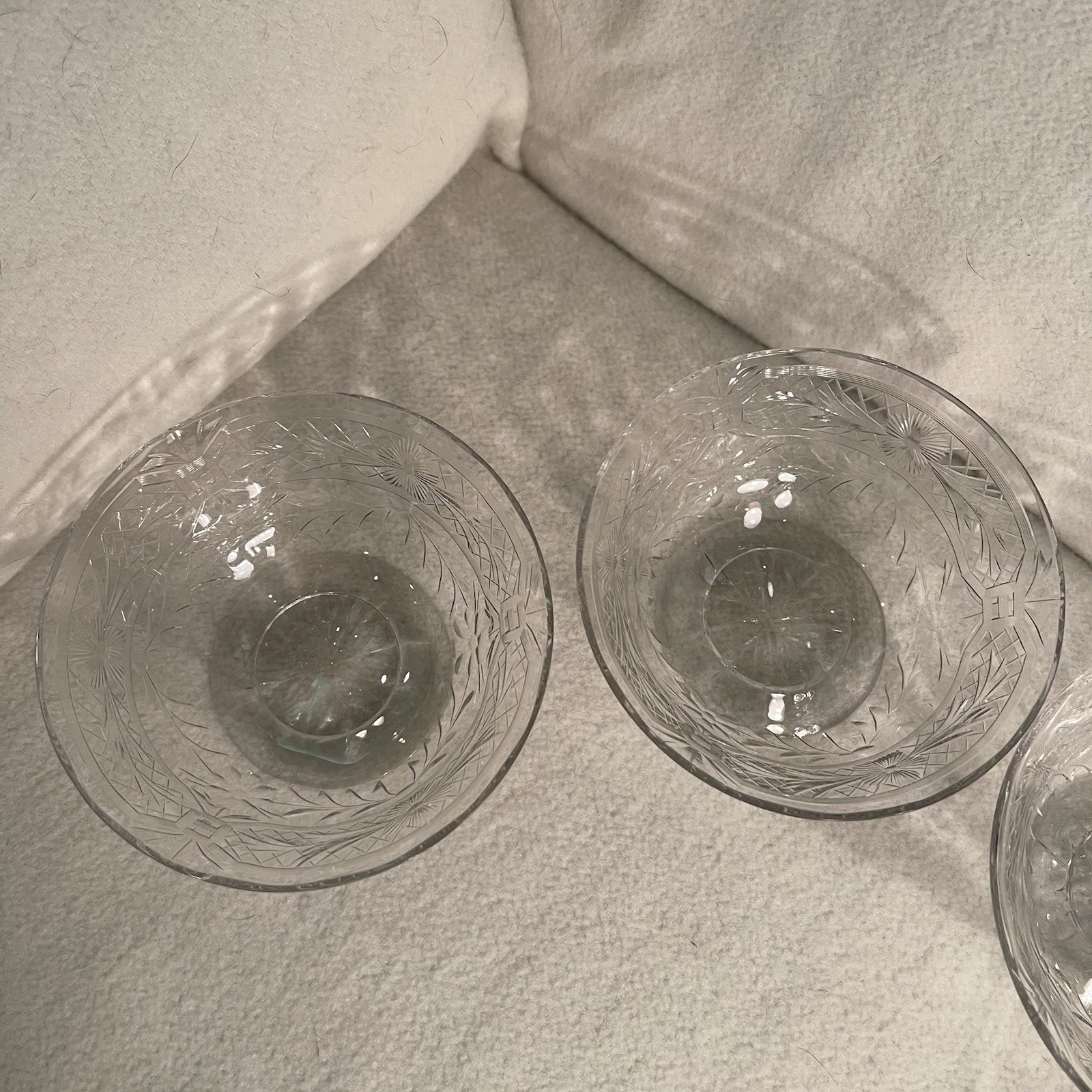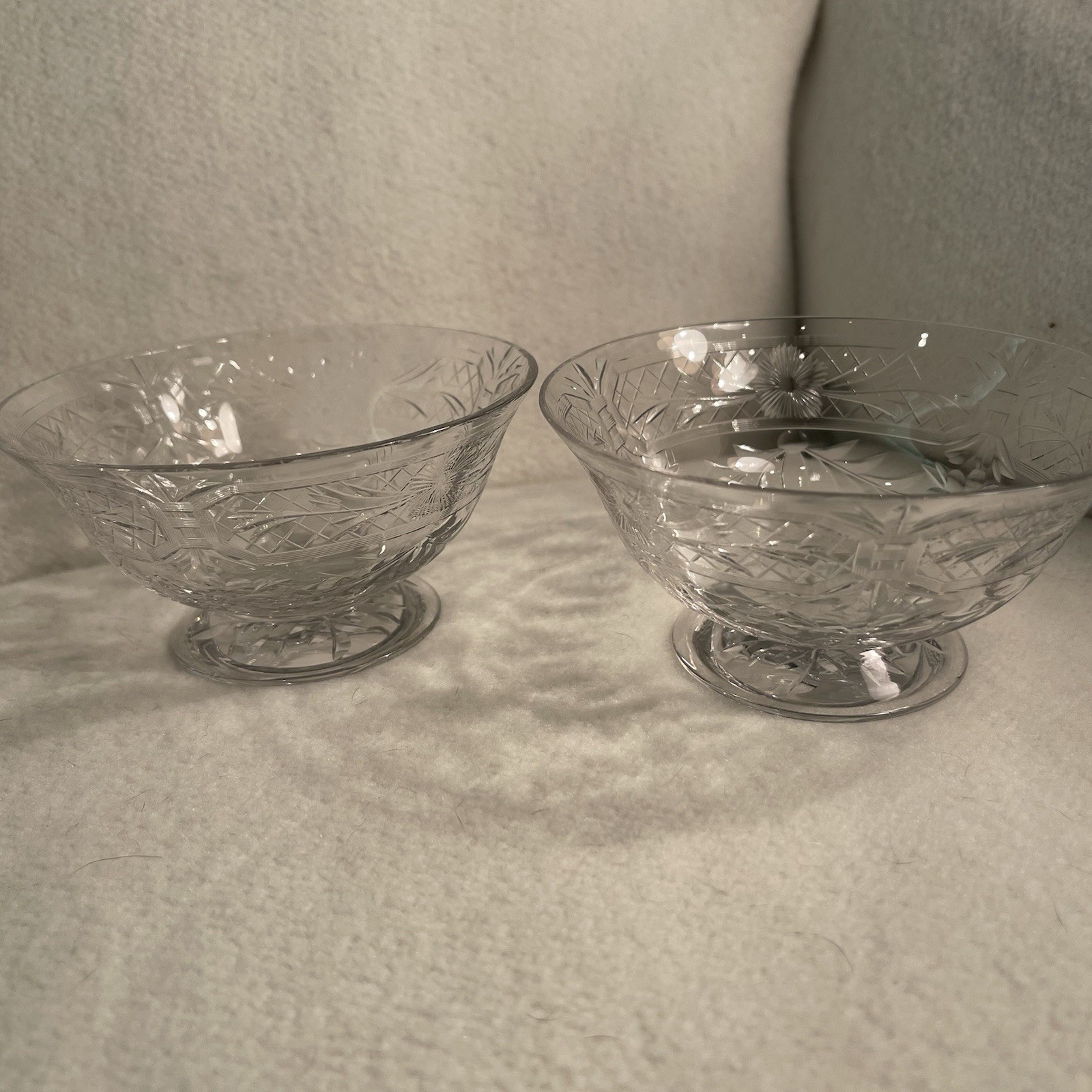 This vintage set of four clear crystal dessert/berry bowls features an etched floral pattern, making them perfect for serving desserts or snacks. The round bowls have a diameter of 4.5 inches and are 2.25 inches tall, with a footed design for added elegance. Made in the Mid-Century Modern style and manufactured in the 1960s using elegant glass techniques, these bowls are a beautiful addition to any table setting. Excellent vintage condition. One glass has a tiny chip on the rim. See photos.