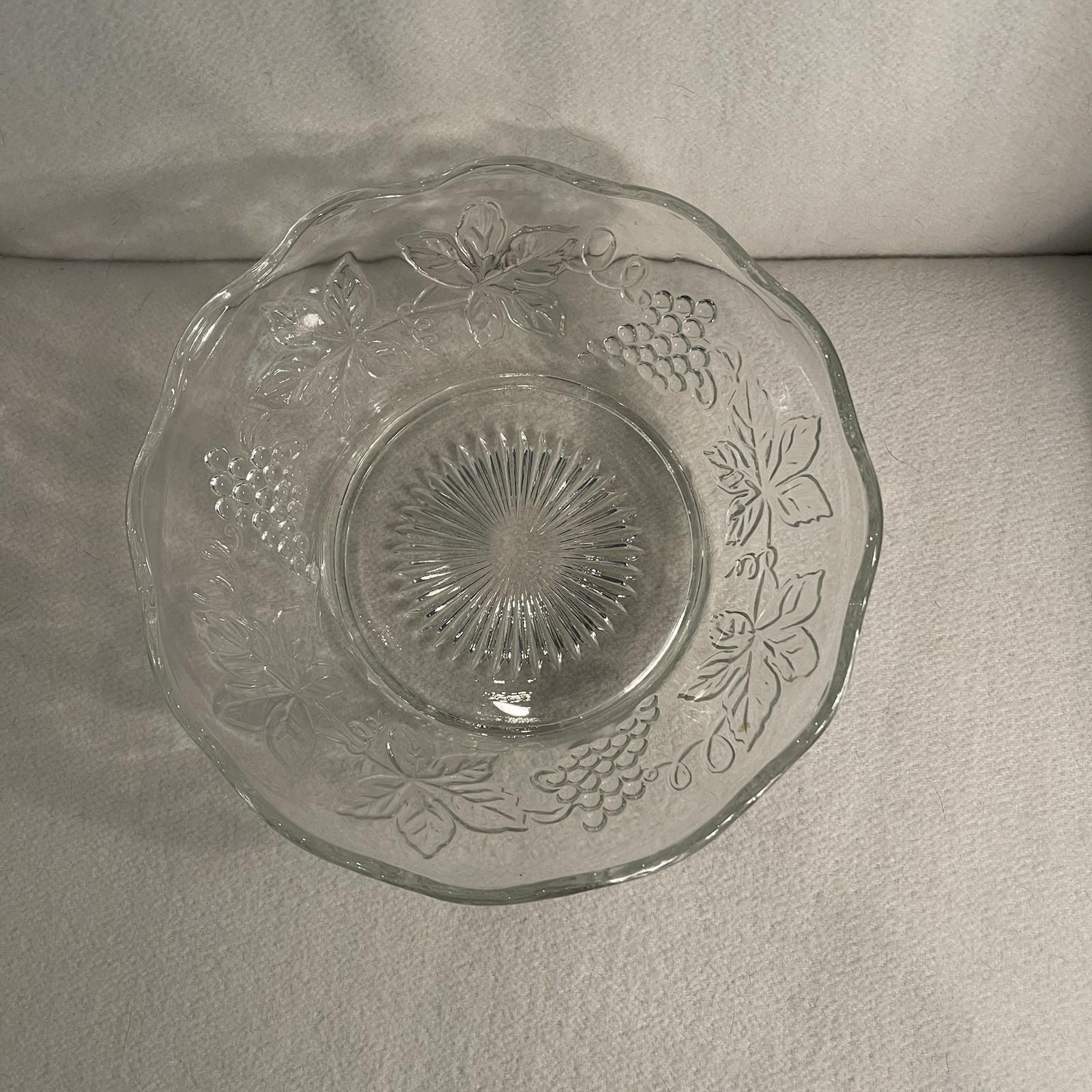 Elevate your serving experience with this exquisite Vintage Clear Cut Glass Serving Bowl, a true testament to the craftsmanship of mid-20th century America. Featuring a starburst center design that catches the light beautifully, this bowl is adorned with delicate grape and leaf patterns, adding a touch of elegance to any table setting. Constructed from high-quality cut glass, the bowl measures 8.5 inches in diameter and stands 3 inches tall, ideal for a variety of occasions. Though care should be taken with hand wash only instructions, this timeless piece is both decorative and functional, sure to impress guests and enhance your dining gatherings. Excellent condition. No chips or cracks.