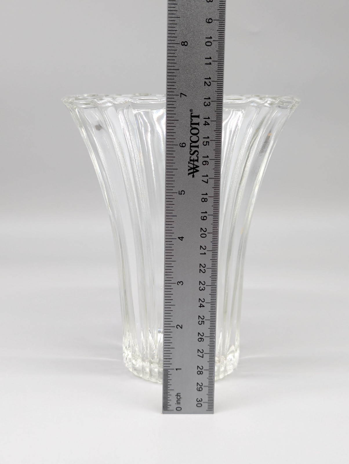 Shipping is calculated and will vary depending on location. This vintage clear cut ribbed glass flower vase exudes elegance with its wide and large design, standing at 7 inches tall. The intricate ribbing and cut glass production style add a touch of sophistication to any home decor. This simple but nostalgic design ensures a timeless piece that complements any flower theme, making it a perfect addition to your collection of decorative pottery and glassware. The wide opening and generous depth can accommodate large bouquets.