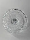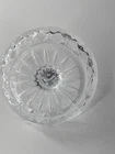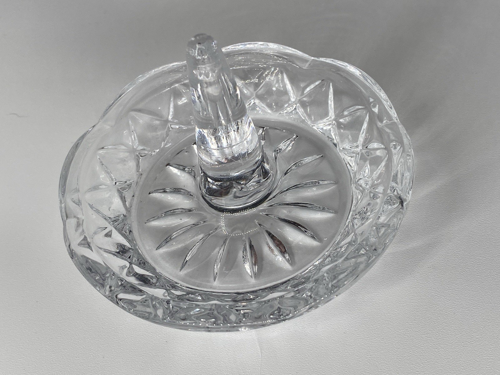 This vintage clear jewelry ring holder is a charming piece. The round swag cut glass bowl dish is perfect for organizing and displaying rings, with its mid-century modern style adding a touch of beauty to any vanity or tabletop. The late 20th-century piece is unmarked, showcasing a classic and elegant design that is both functional and decorative.