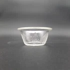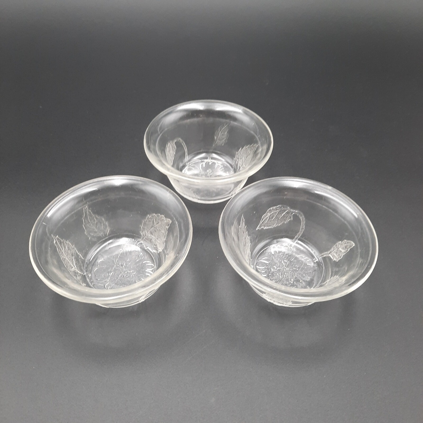 This set of three vintage clear glass dessert bowls features an elegant embossed floral and leaf pattern. Each bowl has a slightly flared rim and textured detailing on the outside with a flower medallion on the base. All pieces are in very good vintage condition with no chips or cracks, just minor surface wear consistent with age.