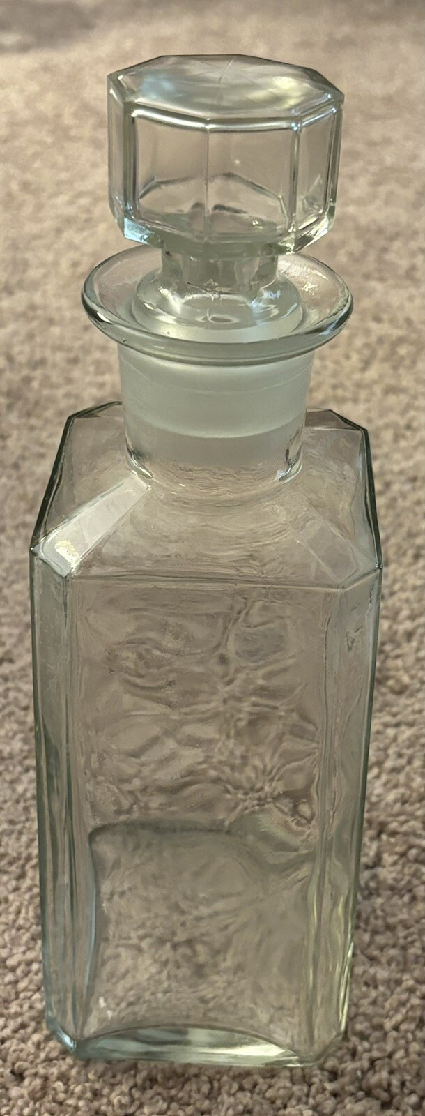 This is a clear glass decanter that could be used for decoration or to hold your favorite beverage. There are no markings anywhere that I can see on the bottle or stopper. It’s about 12 inches/3.5/3.5 Estate sale find in central California