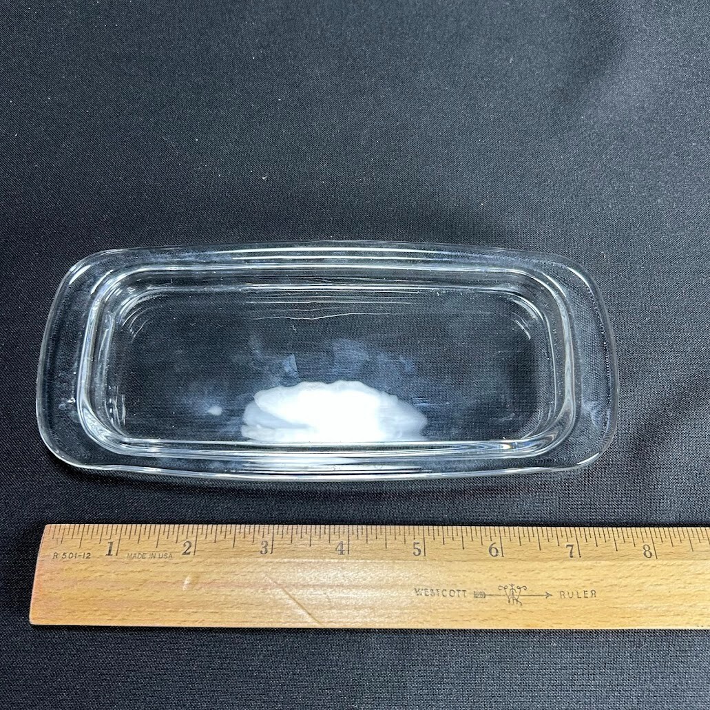 This vintage glass butter dish is designed to hold 1/4 pound of butter. It is made of clear pressed glass, measuring 8 inches in length and 3 inches in height. The dish features a plain pattern and has one compartment. The unmarked brand item comes unboxed and is a rectangular shape, perfect for storing and serving butter in a classic and elegant style.