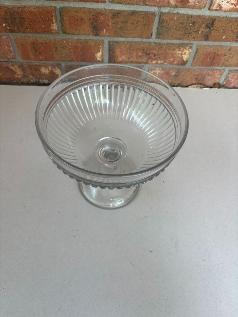 This vintage clear pressed glass ribbed fluted footed compote goblet cup bowl is a beautiful and elegant piece for serving desserts or snacks.