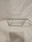 This is a vintage clear ribbed glass rectangular relish dish that can also function as a planter. It is unmarked, made of crystal, and weighs 2 lbs. This antique dish features a single compartment and has a timeless design perfect for serving or displaying small items.