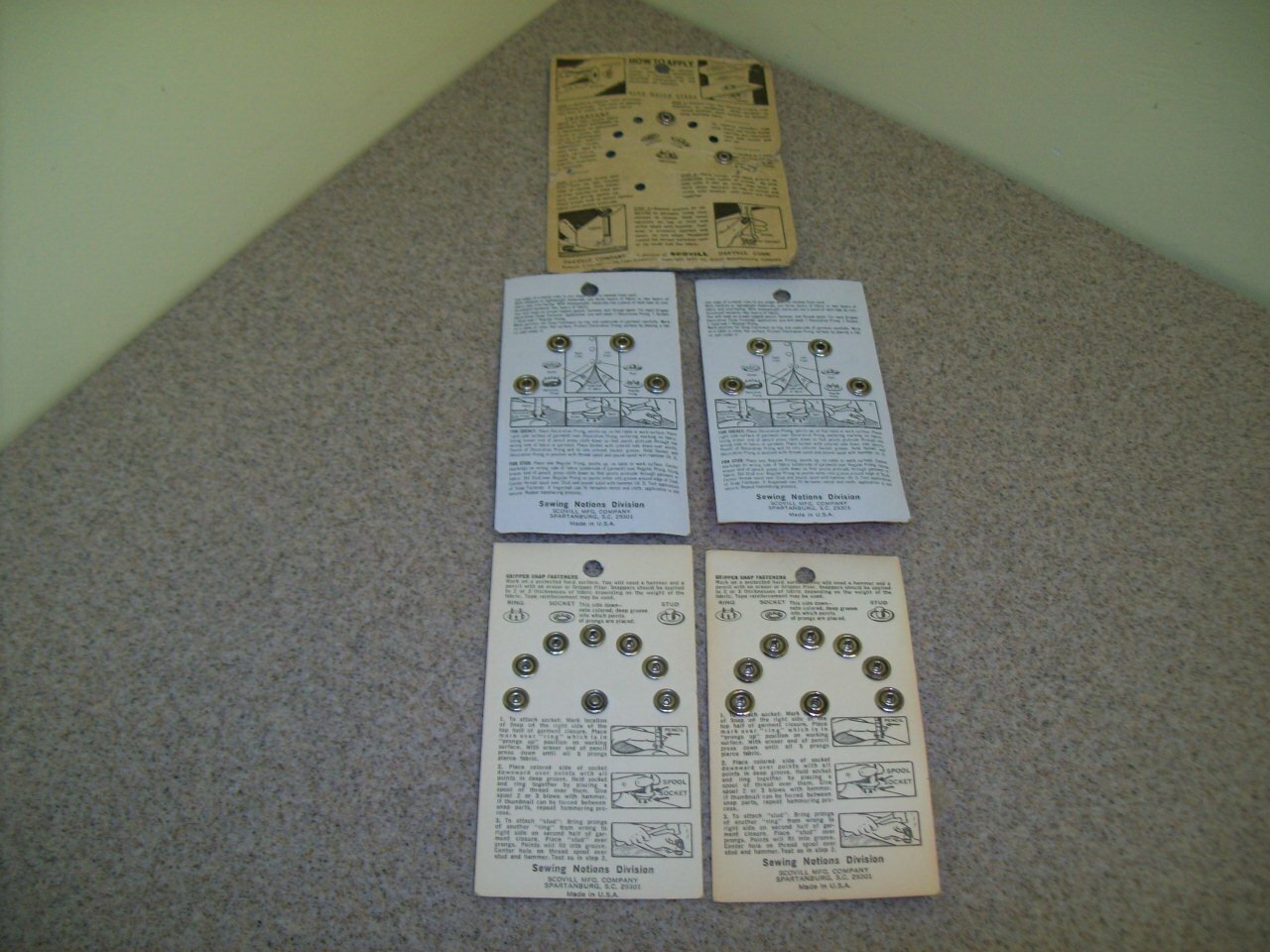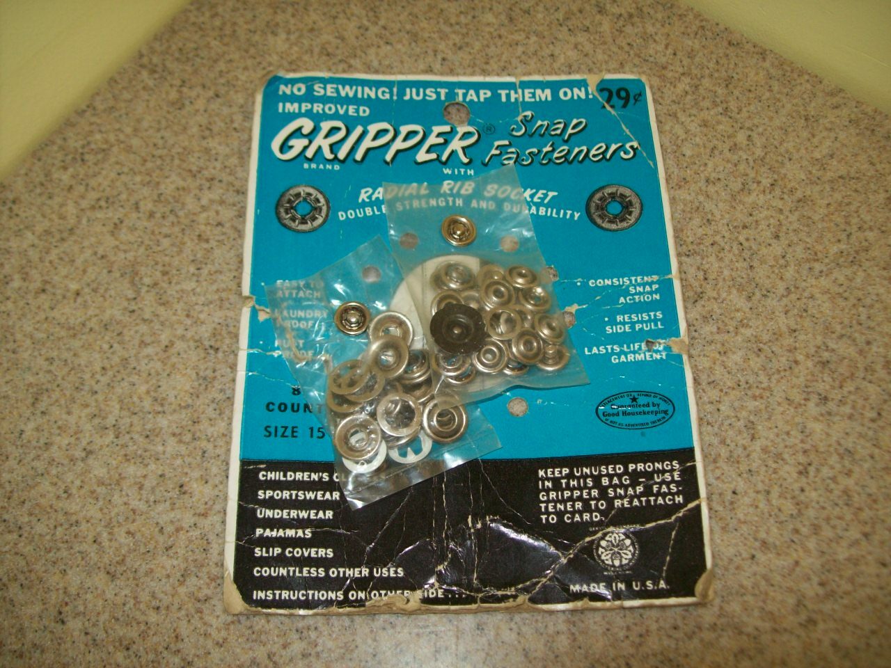 Vintage Gripper Snap Fasteners Clinton & Scovill (Lot of 5 Packages)...Age unknown (New Old Stock)...The packaging has age wear/tear but the snap fasteners have never been used (please see all pictures to determine the condition). There may be some imperfections that I can't detect because the packages have never been opened and selling in New Old Stock/As-Is condition.
