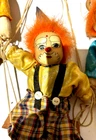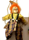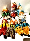 Embrace the whimsy of the circus with this charming vintage clown figurine. Adorned with a vibrant multicolor flannel pattern, this porcelain-faced clown swings merrily on its string, accompanied by eight additional puppet dolls. Each piece is carefully crafted to add a touch of nostalgia and joy to any room, with a bright finish that highlights its playful character. Standing at 10 inches tall, this clown figurine is an unboxed original, making it a versatile addition to your collection or decor. The wooden base provides a stable perch for this delightful clown, which is sure to become a conversation starter and a beloved piece in your home. Whether for special occasions or everyday display, it's a timeless piece that celebrates the timeless allure of clown charm.