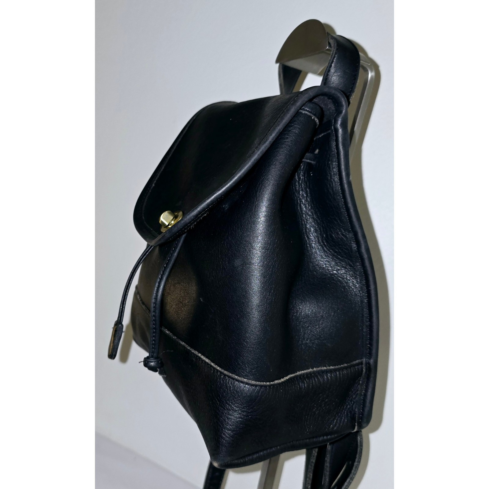 The Coach Vintage 9960 Black Leather Weekender Daypack Backpack Rucksack is a stylish and versatile accessory for women on the go. This small rectangular backpack features a drawstring and turn lock closure, an adjustable shoulder strap, and inner pockets for organization. Made from high-quality leather with gold hardware accents, this vintage piece exudes a classic 90s vibe with a touch of USA flair. Perfect for travel, casual outings, or business meetings, this Coach Weekender backpack is a timeless addition to any wardrobe.