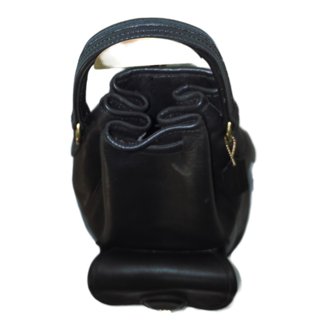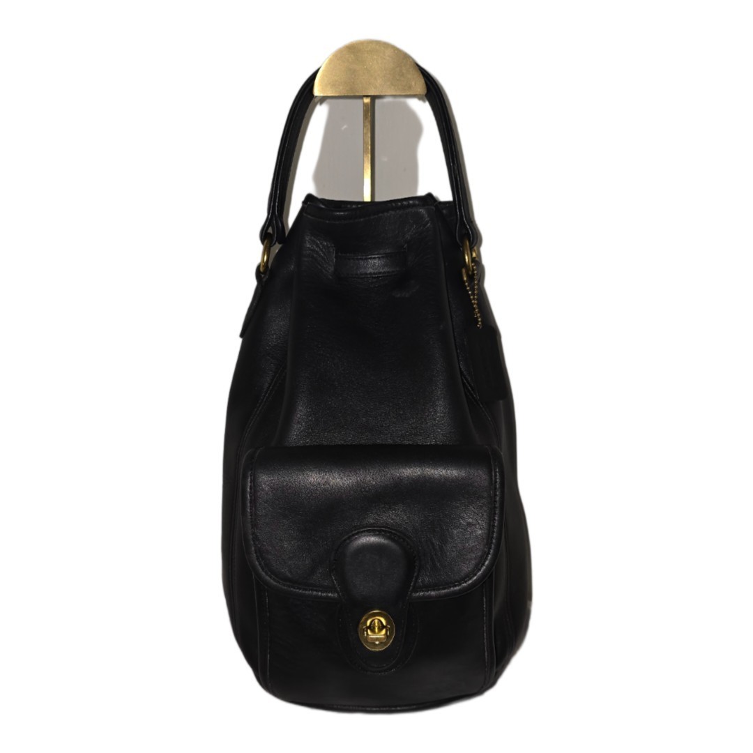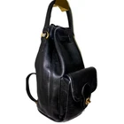 The Coach Vintage 9992 Black Leather USA Slingpack Rucksack Daypack Backpack is a large, cylindrical shaped backpack made of high quality leather with gold hardware accents and a matte black finish. This vintage piece features a drawstring closure, adjustable strap, inner pockets, and a top handle drop of 5 inches. Perfect for travel, casual outings, workwear, or business meetings, this backpack exudes a classic USA-themed style with a hint of elegance. It also includes a bag charm and original dust bag, making it a versatile and stylish accessory for both men and women.