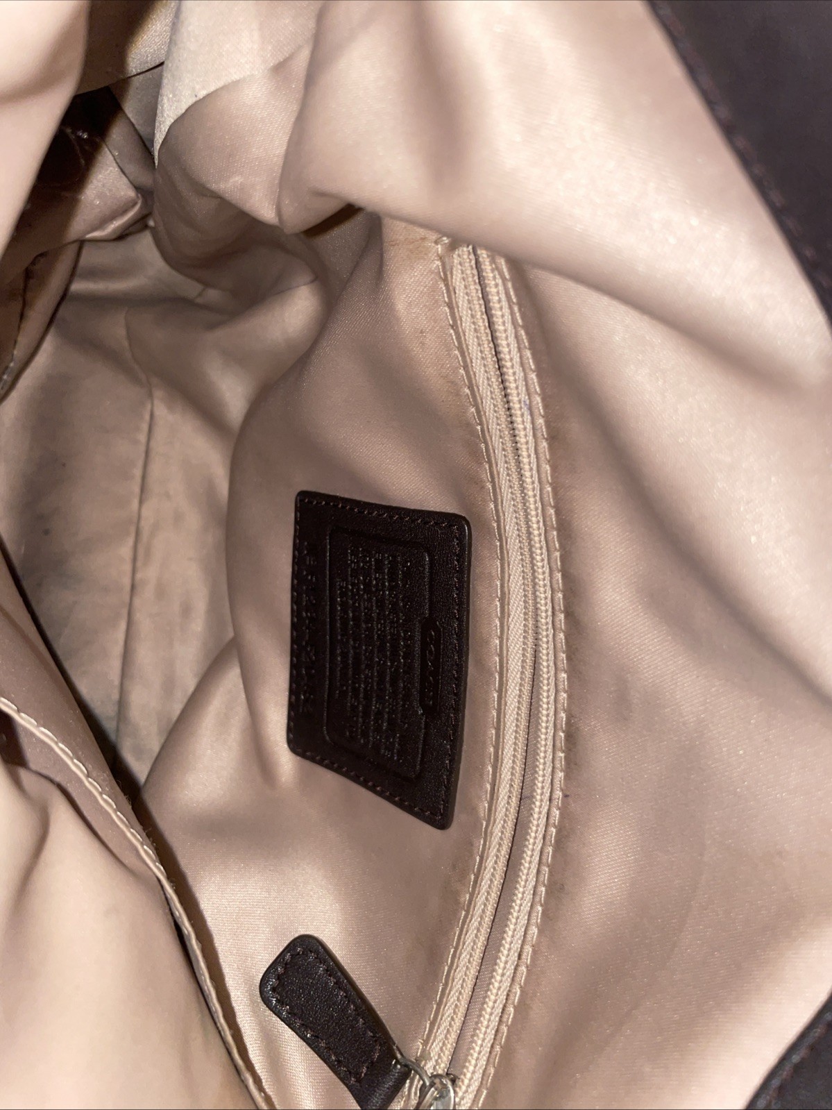 This Vintage Coach Brown Patent Leather Shoulder Bag with Crossbody Strap is a stylish and versatile accessory for women. Made in the United States, this medium-sized square-shaped bag features a zip closure, silver hardware accents, and a beige interior lining. The brown exterior with patent leather material gives it a classic and timeless look, while the crossbody strap adds a practical and trendy touch. Perfect for everyday use or special occasions, this vintage Coach bag is a must-have addition to any wardrobe. Clean see pics no hang tag