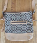 Vintage Coach Brown Signature Leather Jacquard bag crossbody 9349 Y2k Model: 9349. Condition is preowned. Shipped with Ground advantage. - Condition: Good condition. No holes rips or repairs. There is wear on the side of the straps per the photos and light marks on the botton of the purse per the photos. - Height: 26.5 cm - Width: 28 cm - Depth: 10 cm - Handle Drop: 56 cm Thanks for looking at this bag and Happy Shopping!