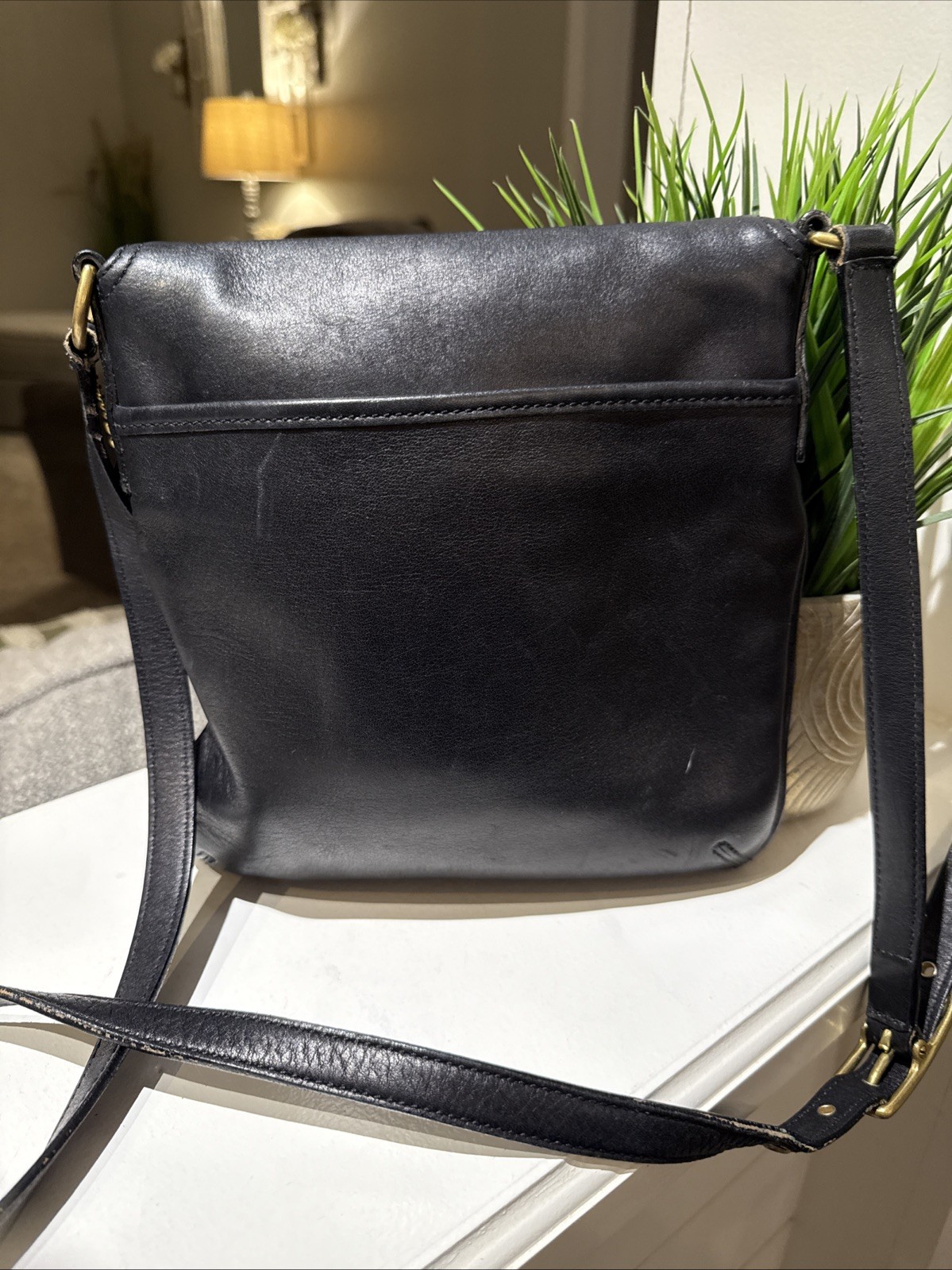The Coach Vintage Legacy Slim Flap G23-9592 Crossbody in Soft Black Leather is a stylish and classic crossbody bag designed for women. Crafted from leather with gold hardware accents, this small rectangular bag features a magnetic closure and a crossbody strap with a 19" drop for easy wear. The interior is lined and includes inner pockets for organization, making it both fashionable and functional. Perfect for everyday use, this Coach Legacy bag is a timeless piece with a vintage appeal, showcasing the brand's signature style and quality craftsmanship. Bag is in excellent condition!