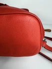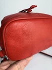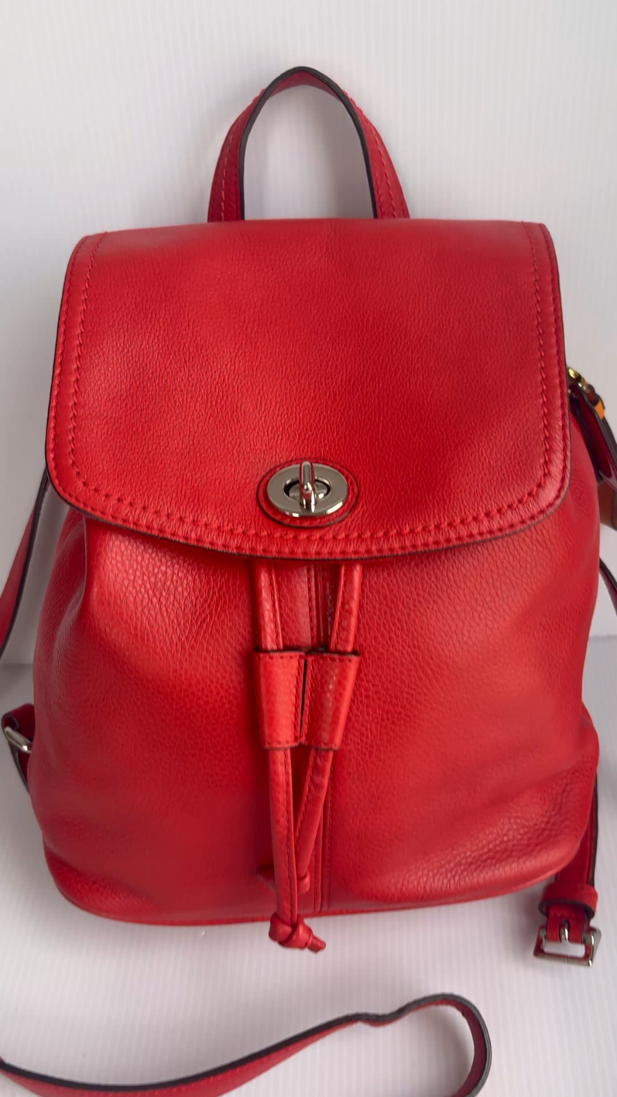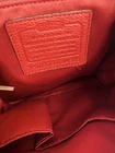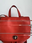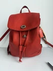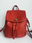 Coach Park Pebbled Leather Turnlock Drawstring Backpack. The model number for this style is often referenced as F24385 or F37581. Product Details Material: It is made of polished or refined pebbled leather. Color: The color is a vibrant red, sometimes referred to as "vermillion red" or "red currant". Closure: The bag features a drawstring closure cinched under a flap with an iconic turnlock for security. Features: It includes adjustable shoulder straps, a top handle, an outside turn-lock pocket, and internal multifunction and zip pockets. Approximate Dimensions: The bag's size is generally around 9-10 inches in length, 9-12 inches in height, and 4-5 inches in depth, with mini and larger versions existing. This backpack is in excellent condition…