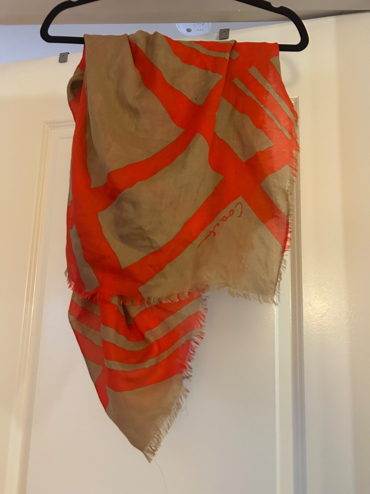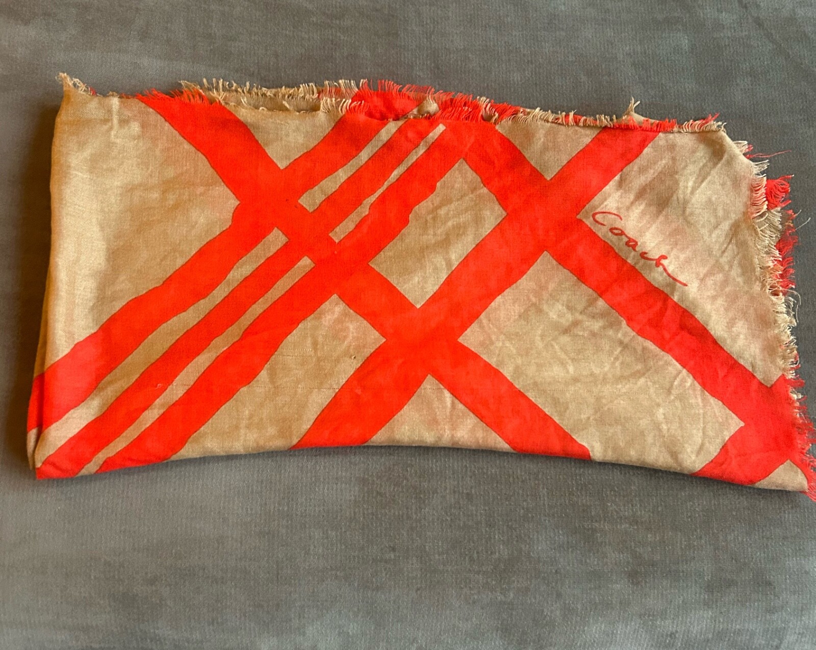 Wrap yourself in the classic sophistication of a vintage Coach scarf, featuring a vibrant orange geometric pattern that's sure to add a pop of color to any outfit. This timeless accessory, perfect for the fashion-conscious woman, showcases the sleek design and quality craftsmanship synonymous with the Coach brand.Whether draped over your shoulders or tied neatly around your neck, this scarf serves as a versatile addition to your wardrobe, elevating both casual and formal ensembles. Its rich heritage and chic style make it an essential piece for anyone who appreciates the blend of elegance and contemporary fashion. Minor snag in last photo