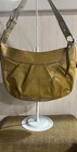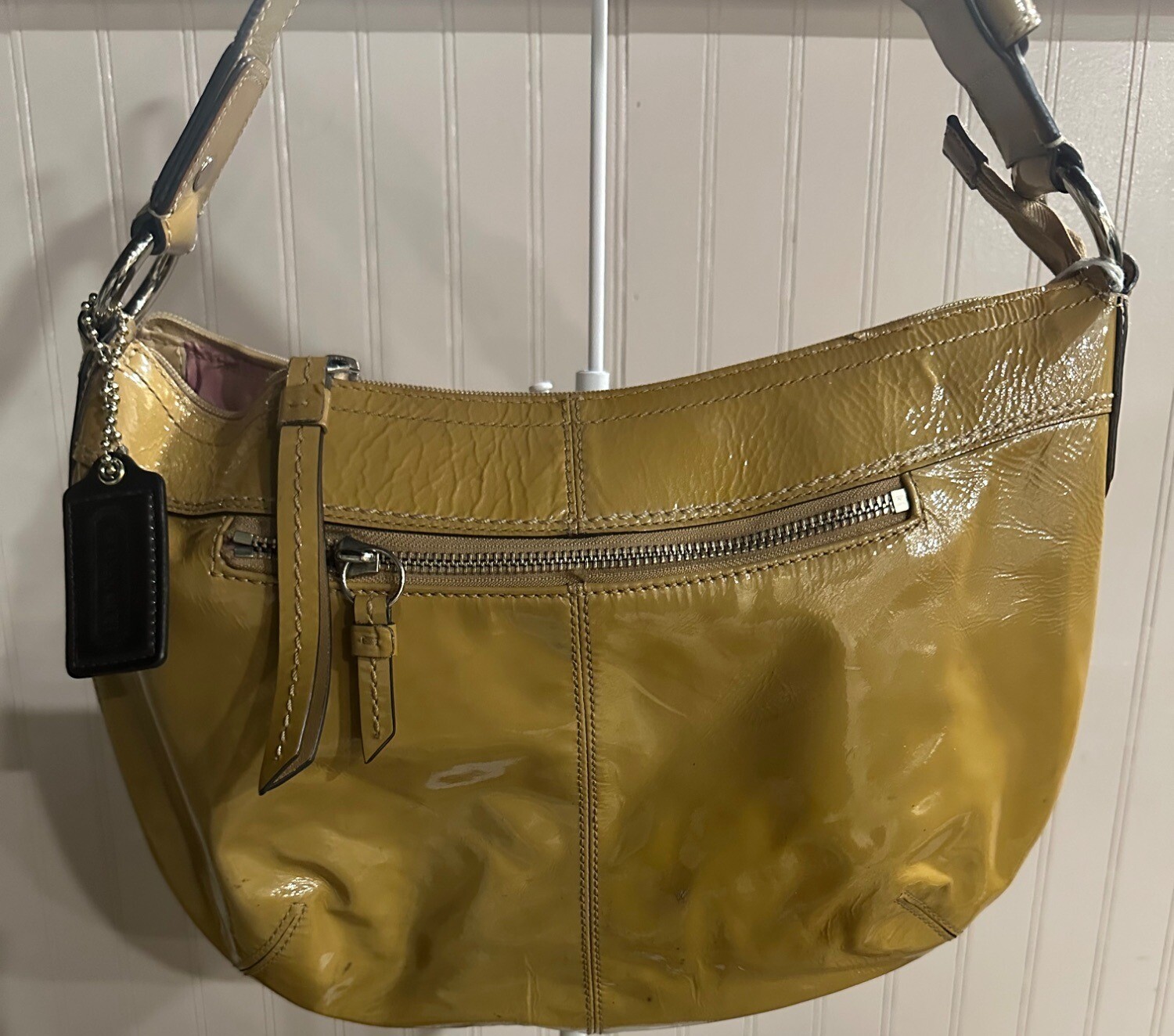 This bag is so yellow even the sun might get jealous. With its shiny patent leather, it’s ready to hold your stuff and your secrets—like how many snacks you can fit inside. • Zippered pocket for secure storage • Adjustable shoulder strap for comfort • Coach tag for authenticity • Stylish pleated design Small marks on front and back of bag small pen marks inside some scuffs on bottom please see all photos Please see all photos as they are part of the description. Always open to reasonable offers! Jewelry is never cleaned as we want to preserve its timeless beauty and aging. Vintage items tell a story and we would like you to see that story. It also allows the new owners to clean in a way that is right for them.