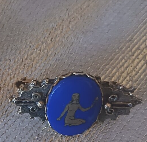 It's a rare and attractive clip, notice the gold tone scroll design on both sides. The lady is holding either flowers or a flame, I can't tell. The front has more of a gold color than how it shows in my pics, not so much black. I found only one on another site with a goat that said it is enamel with porcelain. Take a good look at the pics. Sales are final, ask your questions before buying. I will consider decent offers. Add me to your Favorites cause I am listing daily from a huge inventory! Thank you~ * I don't normally sell internationally, but if you are willing to pay the higher amount it will cost to send it to your location, please don't pay until I find out how much it will be to send it to your country. (#50OFTPDRWYLOBX)