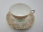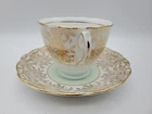 This vintage tea cup and saucer set from Colclough China features a beautiful golden floral pattern that is sure to impress. The set includes a round-shaped tea cup and saucer, both made of high-quality bone china and hand-painted with exquisite details.