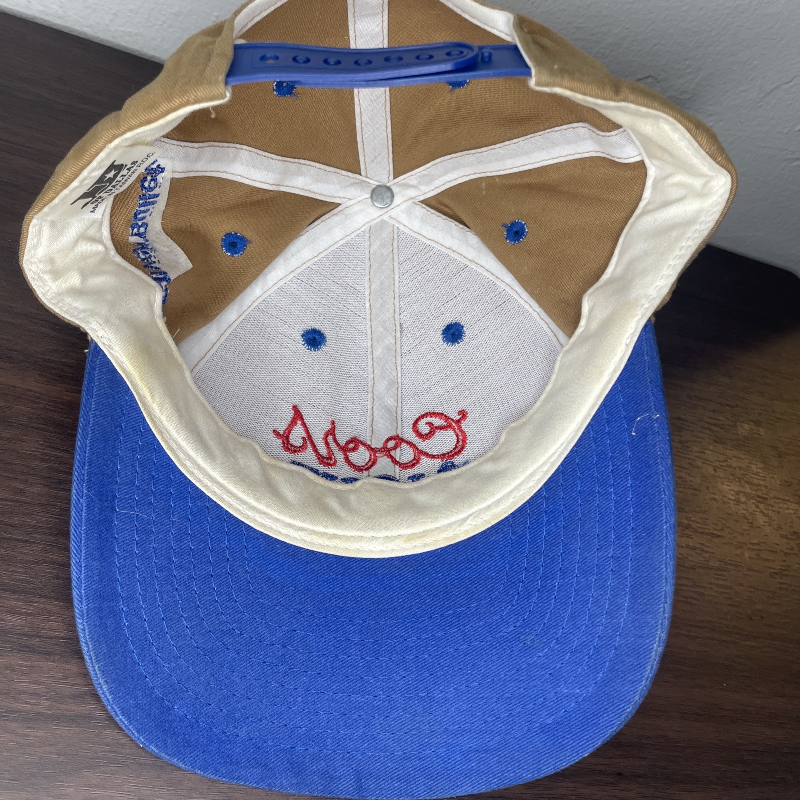 This hat is in very good condition for its age. There are no big imperfections. Inspect closely on photos as this item is vintage and used. The white lining on the inside of the hat is slightly discolored. However this hat has been washed and sanitized. Check out my store for more items like this! All items are packaged with care and consideration. Thank you!!