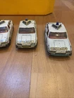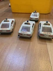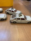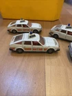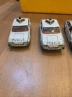 This is a vintage Corgi die-cast model of a Rover 3500 police car in white, with a scale of 1:32. Made in the United Kingdom in 1980, this toy features opening doors and is part of the Corgi Classics series. It is a detailed replica of a 1965 Rover 3500 police car, suitable for collectors or children aged 4 and above. This job lot includes four of these classic Corgi vehicles. 4 cars for renovation see photos