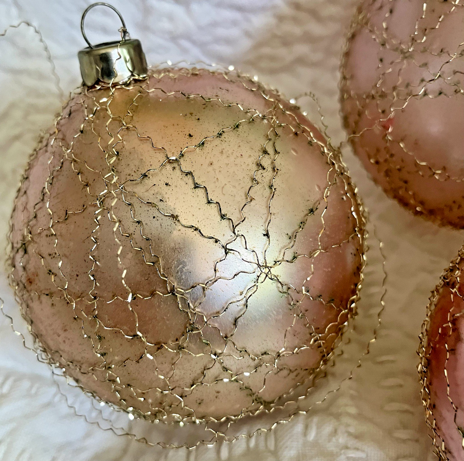 Vintage Crimped Wired Wrapped Christmas Ball Ornaments Japan Blush Pink Lot of 4 On two, the wire has come loose in a few places..see photos. I would fix it but I don't know how and would just ruin it. Let me know if you need more info or photos lowes