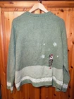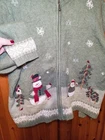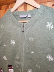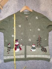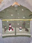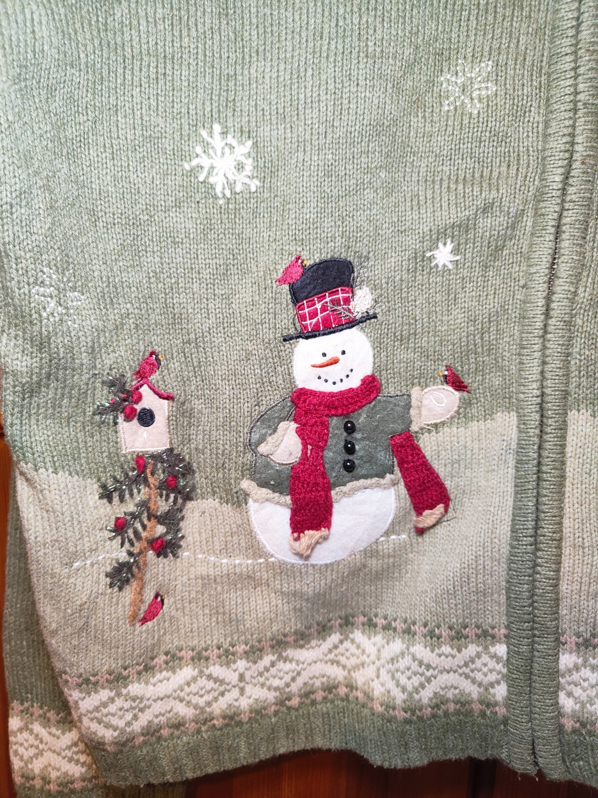 Vintage Croft & Barrow zip-up Christmas cardigan in sage green with embroidered snowmen, trees, and snowflakes. Soft ramie-silk blend, label size XL (pit-to-pit 25", length 27"). Classic late 90s festive knit with cosy winter vibes. Light bobbling may be present due to age – recommend gentle hand wash before wear. Great wearable vintage piece!
