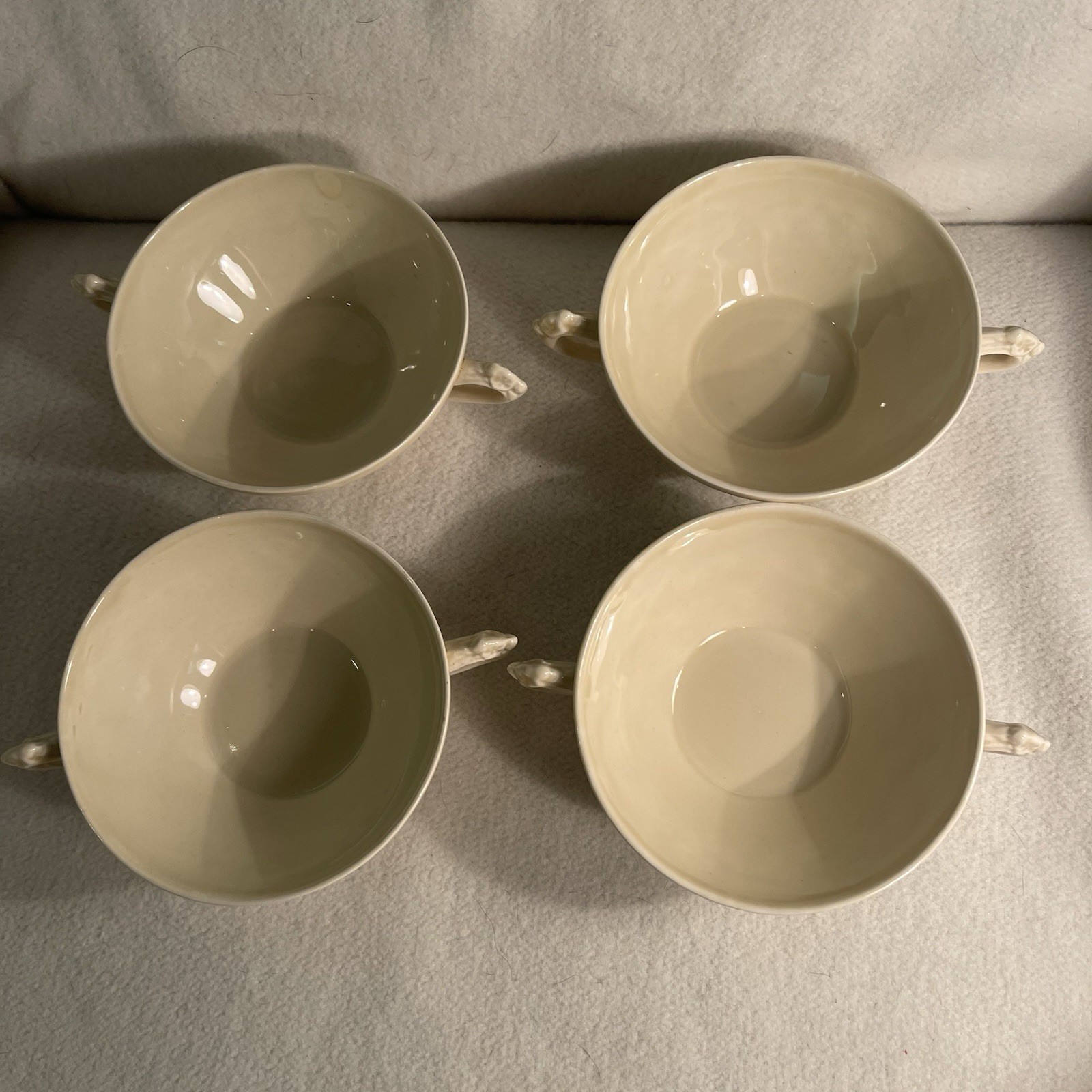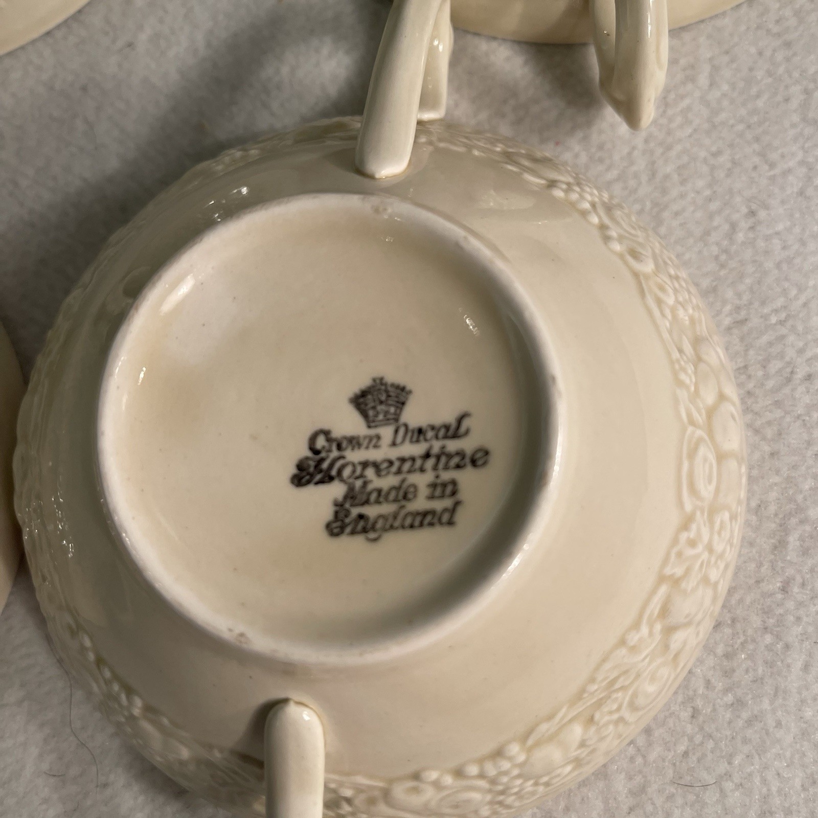 The Vintage Crown Ducal Florentine Double Handled Cream/Soup Bowls, Set of 4, are a charming addition to any dinner table. Made of high-quality porcelain in England during the 1950s, these round bowls feature a beautiful Florentine pattern in cream color. With decorative handles and a vintage design, these soup bowls are perfect for all occasions and add a touch of elegance to your dining experience. The set includes four original pieces from the Crown Ducal brand, showcasing the art pottery production style and reflecting a fruit theme in their design. Excellent condition. No chips or cracks.