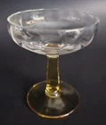 Set of 4 vintage champagne glasses. Tops are clear with a scalloped design. Stems are gold. 3 of the glasses have a tiny flea bite on rims. Barely noticeable. See last close up photo. 4.5" tall. Great overall vintage condition.