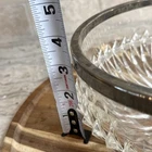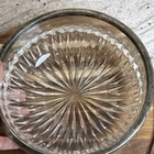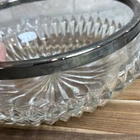 This vintage crystal pressed glass bowl with a silver plated metal ring is a stunning piece of decorative cookware. The clear glass bowl features a vintage pattern and is made of pressed glass, giving it a unique and elegant look. The set includes a plate, making it ideal for serving snacks or desserts in style. The combination of the crystal glass and silver plated metal ring adds a touch of sophistication to any dining table or display cabinet.