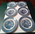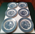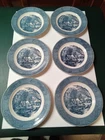 This Vintage Currier & Ives Royal China Dinner Plates set features a classic "The Old Grist Mill" pattern in a multicolor design. The set includes six 10" round dinner plates, showcasing a mid-century modern style with a glossy finish. Each plate is part of the original production line by Royal China in the mid 20th century, reflecting a stackable and decorative feature that adds a touch of nostalgia to any dining occasion. These ceramic plates from the United States are adorned with a painted backstamp and are recommended for hand wash only to preserve their vintage charm. These plates are in used condition with no chips or cracks. A couple of the plates have black marks on the back and one has an ink mark. See photos.
