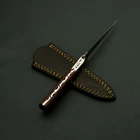 Brilliant Custom Handmade Damascus steel Hunting/Skinner handmade Knife / Sheath Behold the captivating masterpiece that is our Radiant Handmade Damascus Steel Knife with Enchanting Bolster and Custom Sheath. Immerse yourself in the enchantment of this exquisite blade, meticulously crafted to perfection with the finest materials and unparalleled craftsmanship. The heart of this extraordinary knife lies in its exceptional Damascus steel blade. Hand-forged by skilled artisans, the blade showcases the mesmerizing patterns of the Damascus technique, created by carefully layering and manipulating different types of steel. The result is a blade with striking visual appeal, as the intricate waves and ripples dance across its surface, making each knife truly one-of-a-kind. To complement its beauty and ensure its protection, this captivating knife comes with a custom sheath. Expertly tailored to fit the knife perfectly, the sheath is a testament to fine craftsmanship and attention to detail. It not only safeguards the blade but also adds an extra touch of sophistication and luxury to the ensemble. Manufactured with ultra-sharp hand forged Damascus steel cutting core at HRC58-60 hardness, this USA knife comes with unrivaled performance and incredible edge retention; Damascus steel outperforms high carbon steel in durability and is easier to sharpen as mix of high chromium steel enhance the other alloying elements. Perfect for hunting, fishing, hiking, camping, boating, backpacking, or any other outdoor adventure. It is also a key item to add to your survival tactical gear! Overall Length: 9” · Blade Length: 4.5” · Handle Length: 4.5” Handle is made of wood/rose/Pakka We do sell wholesale, please contact us for special discounts on bulk orders. FEEDBACK POLICY: YOUR FEEDBACK IS VERY IMPORTANT FOR US, IF THEIR IS ANY KIND OF PROBLEM PLEASE GIVE US OPPORTUNITY TO SORT THE ISSUE