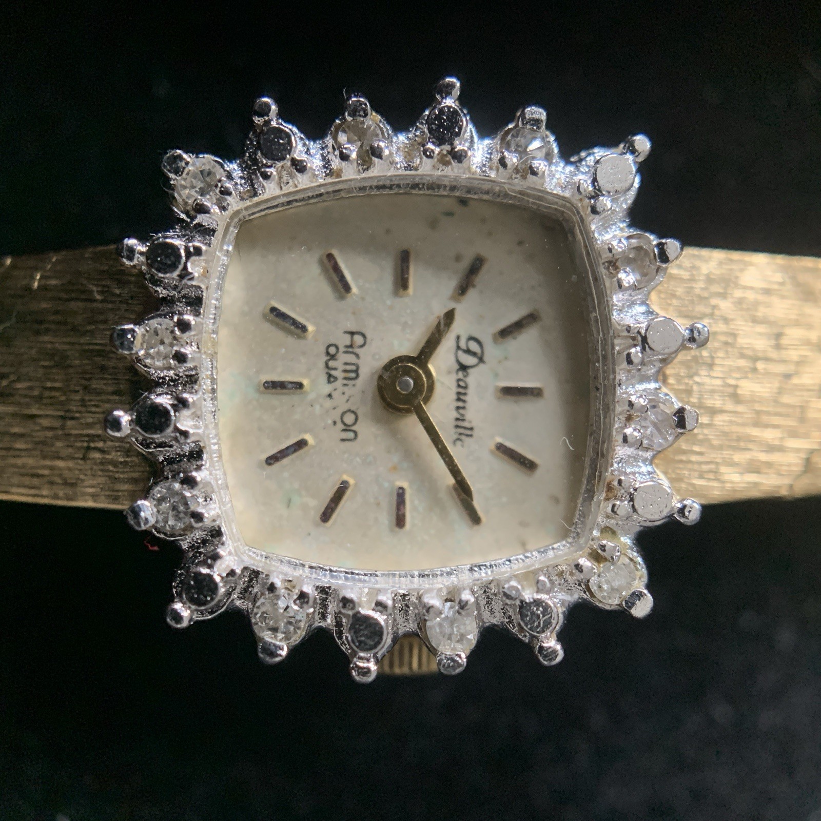 Vintage Armitron DEAUVILLE Gold-Tone Quartz Watch – Diamond Accents (Untested / Not running ) Elegant Square case in gold-tone finish with Diamond accents on the bezel for a classic vintage look Quartz movement – currently untested and not working ** The dial printing shows fading, and there is noticeable fading to the gold plating beneath the buckle snap, consistent with age and wear. Sold as-is, for parts, repair, or display No returns accepted
