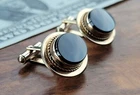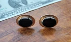 Vintage DESTINO Cufflinks - Oval - Gold Filled/Black Onyx DIMENSIONS: Front: 25 mm x 20 mm. Cabochon: 18 mm x 13 mm. Total weight, both cufflinks: 13.3 grams. DESCRIPTION: Vintage cufflinks. By DESTINO. 1/20th 12K gold filled cufflinks. Oval front with bezel-set flat oval black onyx cabochon and twisted wire accent. Bullet toggle with hinged post. All original. Maker's marks: "Destino © - 1/20th 12K G.F. - D&F"; "Pat 2093723 - Pat 2544833". Mid 20th century. USA. CONDITION: Both cufflinks are in excellent original condition. No damage and no significant wear. No restorations / repairs. Gently used, not abused. No dings, dents, scuffs, cracks, splits, bends, breaks. No significant scratches or rubs. No significant edge wear. The hinges and toggles hold position as designed with no issues. On close inspection you may detect light typical use- / handling-related wear: scattered fine superficial scratches and rubs. Nothing at all significant or conspicuous. Old patina as found. Light typical age-related oxidation.