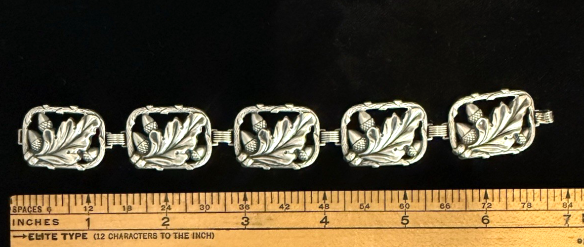 The Sterling Silver Vintage Danecraft Leaf & Acorn Bracelet is a beautiful and elegant accessory crafted from 925 sterling silver. The bracelet features a leaf & acorn design, making it a stylish and unique piece of jewelry. With a length of 7 inches, this bracelet is perfect for adding a touch of sophistication to any outfit. The simple and classic design of this bracelet makes it versatile for both everyday wear and special occasions.