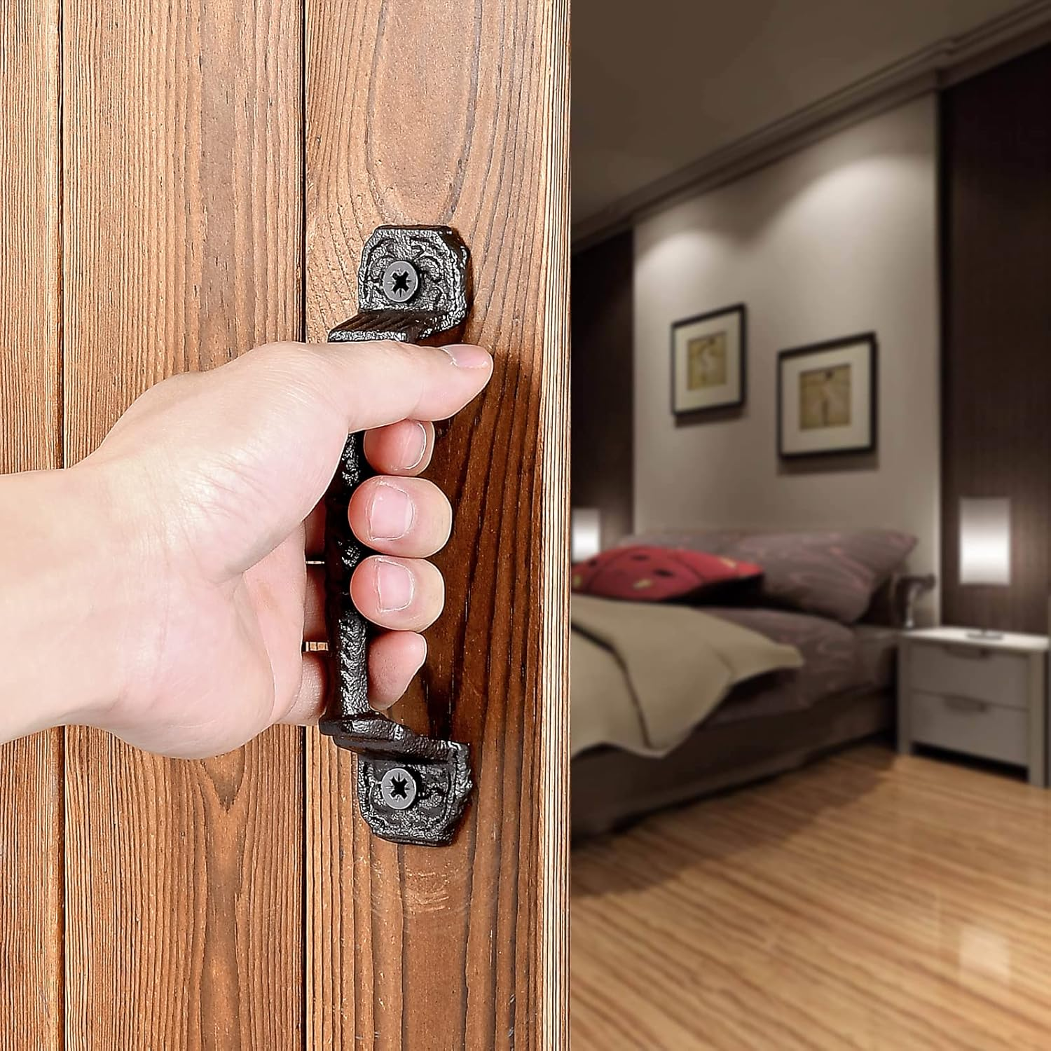 Love these vintage barn door handles! The dark brown finish gives them a rustic charm that instantly elevates any space. Super sturdy cast iron construction feels durable, and they were easy to install with screws. Perfect for sliding doors, cabinets, fences, or even drawers—so versatile! The set of four is a great value, and the antique look adds character to both indoor and outdoor projects. Highly recommend for anyone wanting a touch of farmhouse style!
