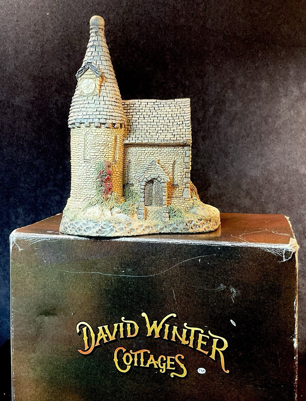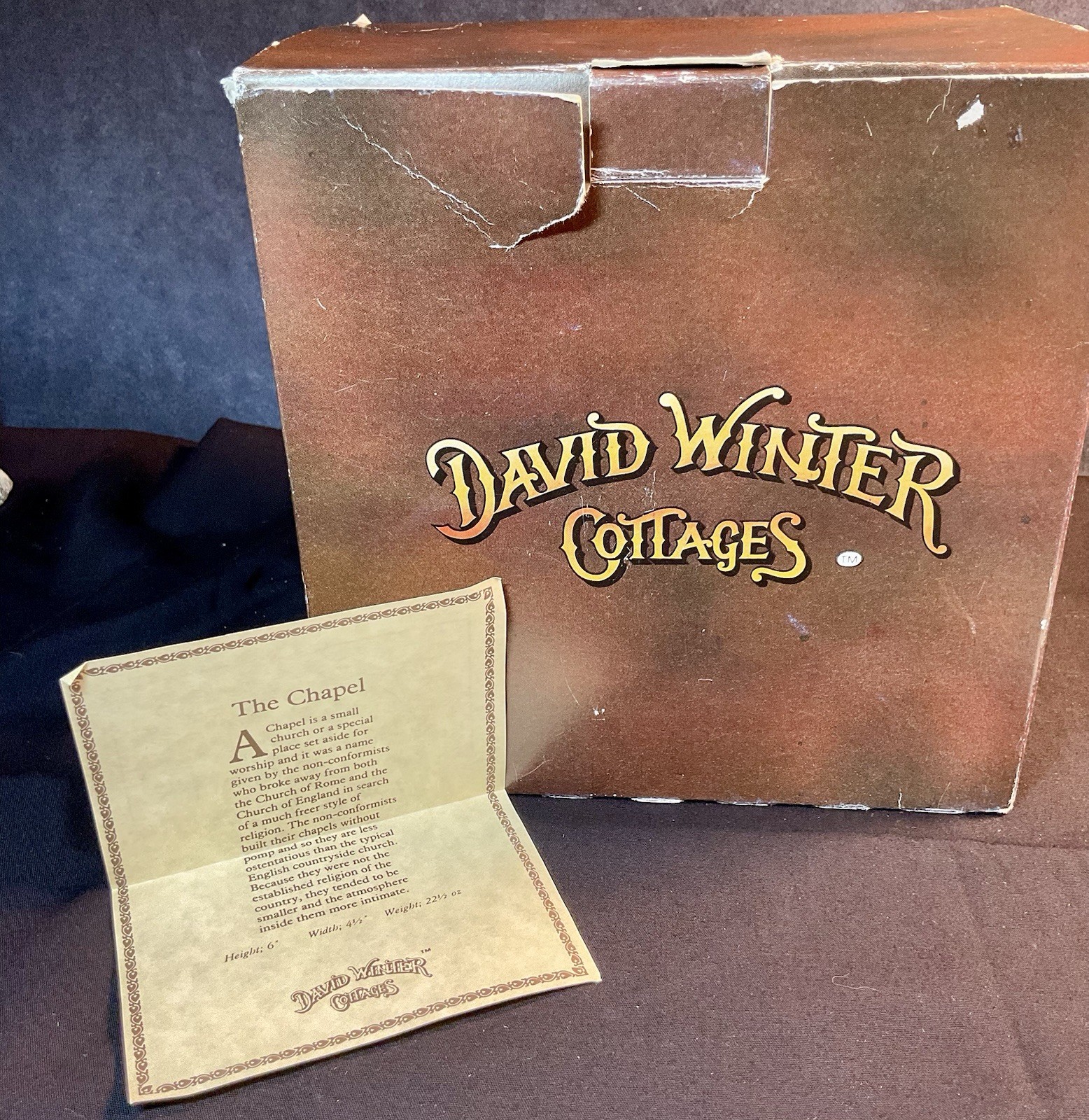 Offering for sale a vintage 1985 “The Chapel” by David Winters Cottages with the original box and Certificate of Authenticity. The Chapel features arched door and windows with climbing red roses and a tower with a clock. It is 4 inches long by 4-1/2 inches wide by 6 inches tall and weighs 22 ounces. The Chapel is pre-owned and is in very good to excellent condition. The Chapel comes with its original box, which has seen better days. Check out the photos. Thanks for your interest.