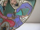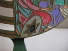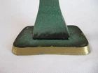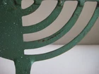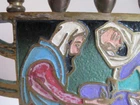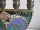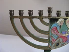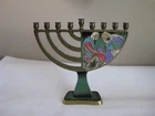 For your consideration is this very unique vintage menorah. This is made by Dayagi and Made in Israel. It is marked on the bottom. Menorah measures 7 3/4" high at center x 7 7/8" long x 1 7/8" deep at base. Very unique design; I have personally not ever seen one like this but I am hardly an expert. Please see all pictures as they are part of the description! There are some scuffs / scrapes / chips to the green and black paint accent at base. There are also whitish marks on the painted images; primarily on the red sections but here and there throughout. These look like losses of the paint from over the years of love and use. Has some scratches here and there and age marks to metal and darkening here and there. Also some larger scratches on the green paint on back.
