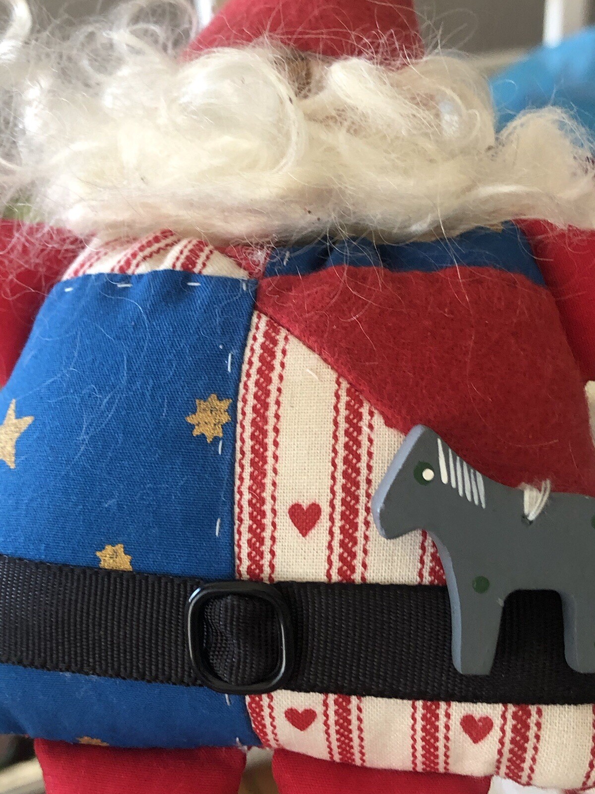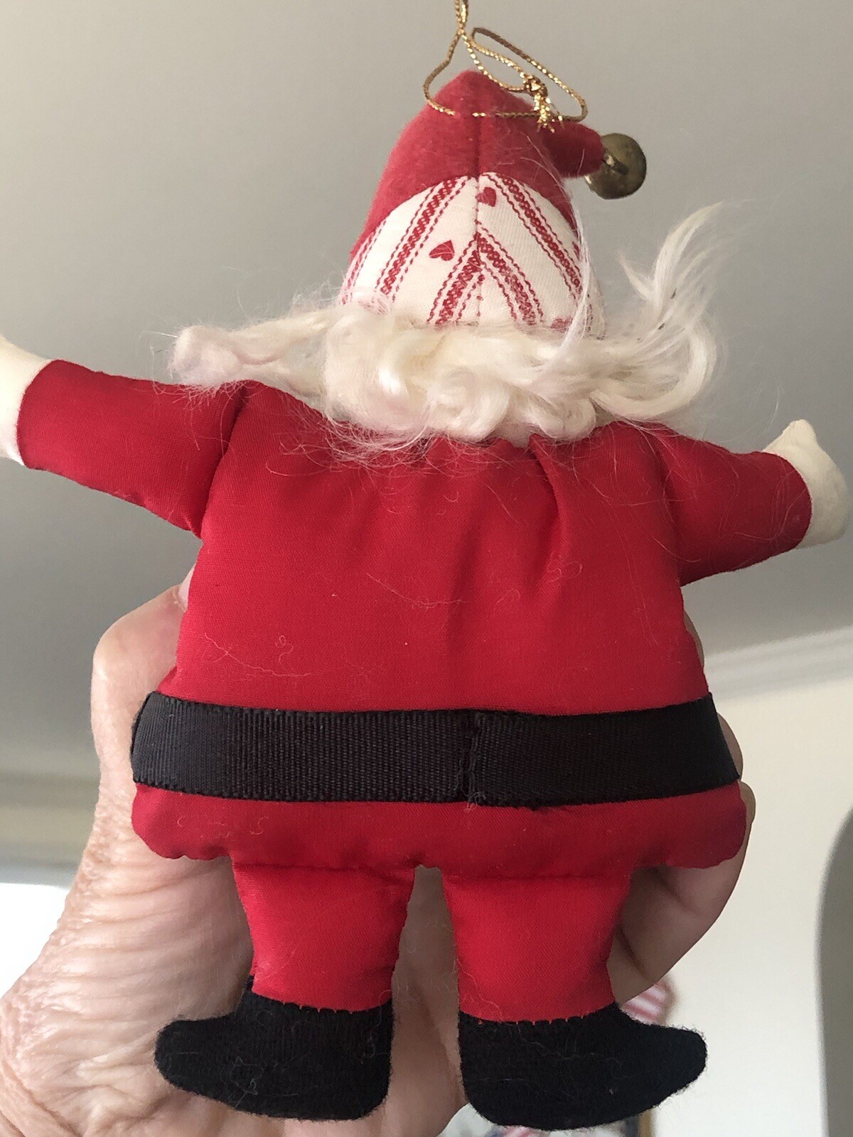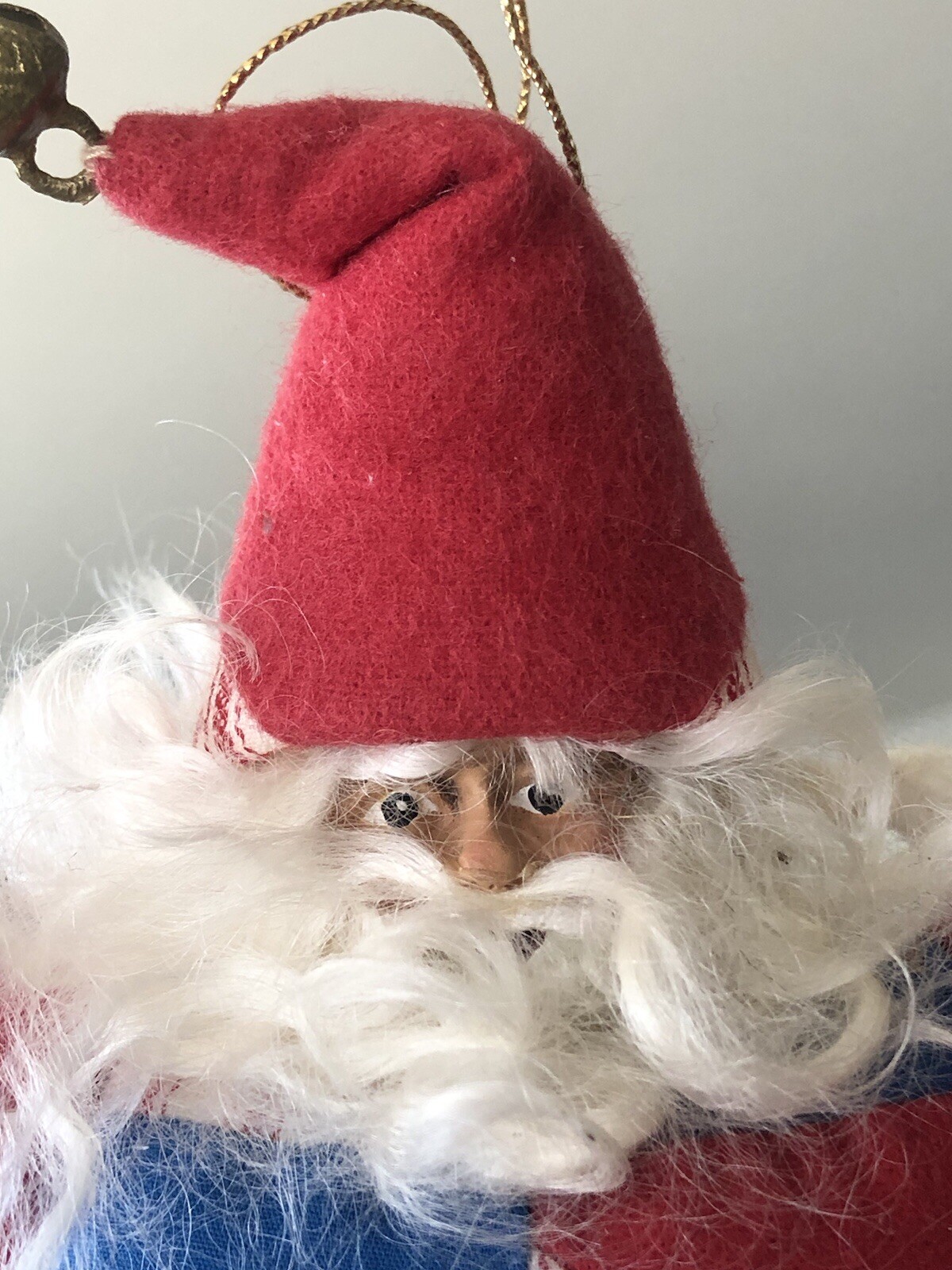 This vintage Santa ornament is a made by HOUSE OF HATTEN & is a licensed reproduction of a DEE GANN “Ye Olde Santa Maker” design It is a unique and charming addition to any Christmas decor. The patchwork body design, featuring a mix of materials such as faux fur beard, a brass bell, red felt hat, resin face, grosgrain black belt & carved wood pony and polyester fill, gives this ornament a rustic and decorative feel. The hand-painted face and quilted details add to the ornament's charm, making it a perfect hanging decoration for any holiday season. Measures: 7” tall x 6.75” wide and hangs 9.5” overall Ready To hang by attached gold metallic cord~ EVC Made in the Philippines Please see photos for exact item you will receive I ship USPS within one business day of receiving payment(usually same day!) CTBTTBIN