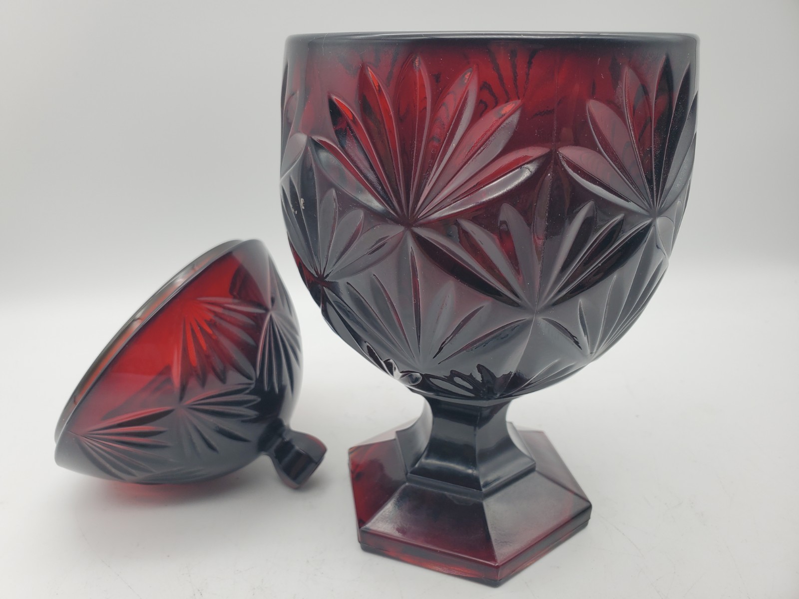 The Cristal D’arques Durand Luminarc Ruby Red Glass Egg Pedestal Candy Dish Jar is a stunning antique-style collectible featuring a vibrant red glass design. Made by the reputable brand Luminarc, this original piece adds a touch of elegance to any decor with its unique egg-shaped pedestal base. Perfect for displaying candy or potpourri, this beautiful glass dish is a must-have for collectors of decorative items. Made in France circa 1984, this piece features the beautiful fanned fern pattern and stands 8.75" tall with its lid and 4.5" in diameter. The deep red color makes it great for bright holiday candy, or any time of year.