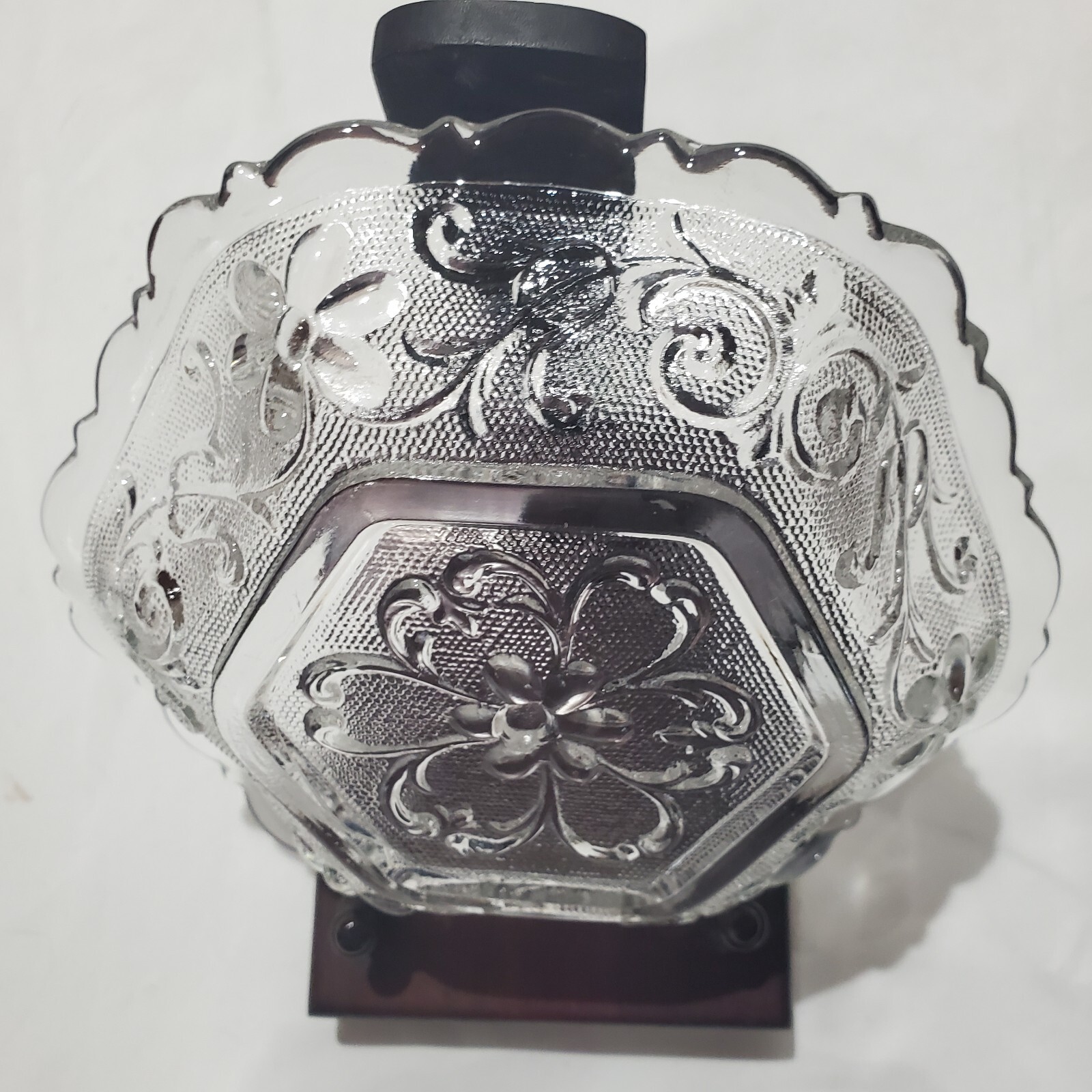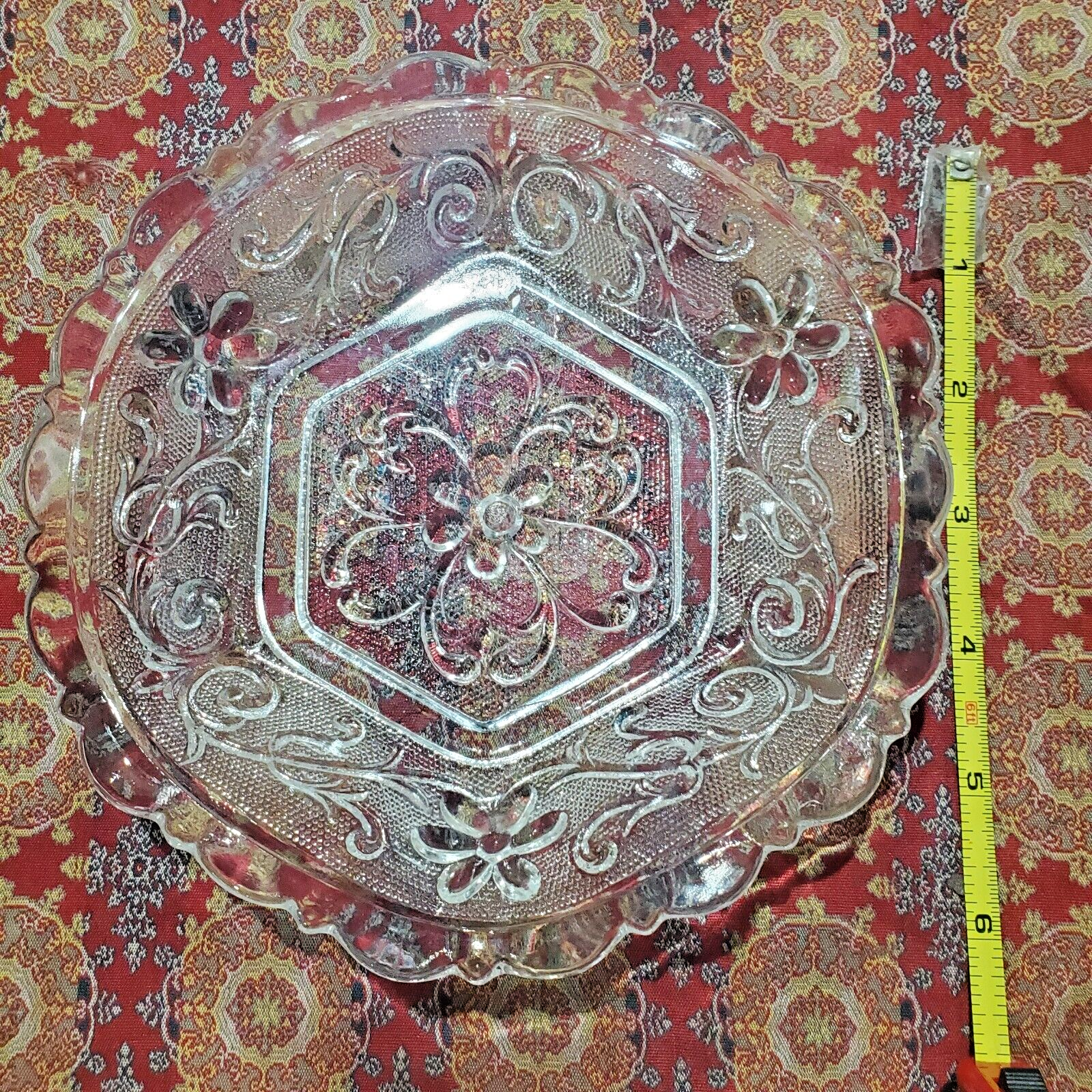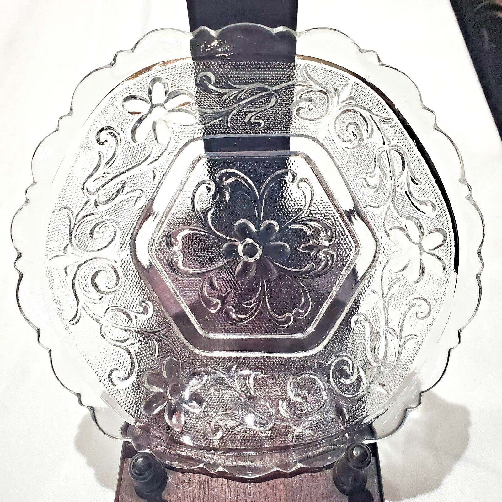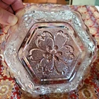 Very pretty 6 sided, scalloped depression glass dish with floral pattern impressed. It holds about 10 oz. and would be a lovely container for cranberry sauce! Condition is good. It is 6 1/2" wide from each of the 6 sides and about 1 1/2" deep.